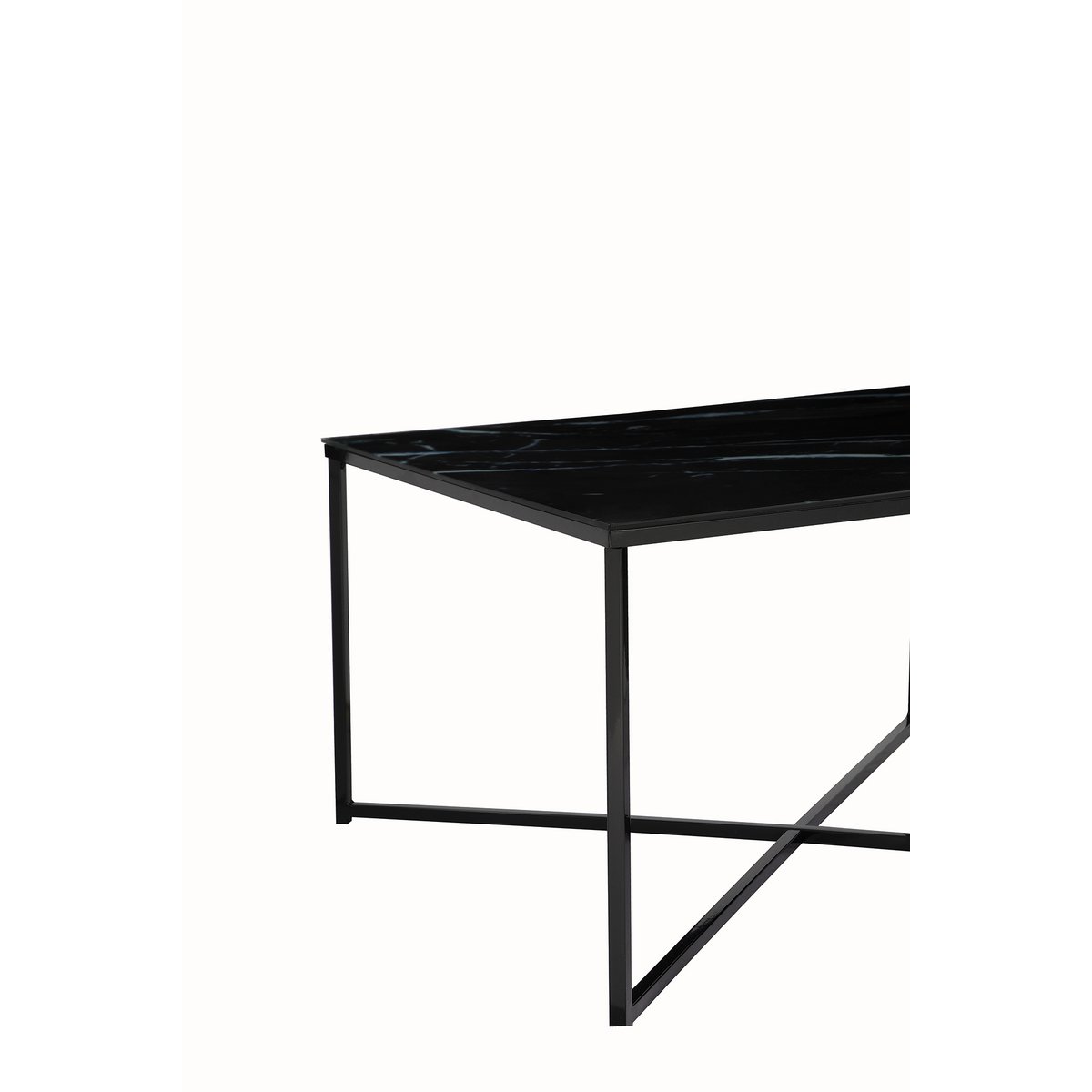 De vierkante salontafel combineert modern design met een dosis extravagantie. Het glazen blad met daaronder een marmerlook folie past perfect bij het zwart metalen frame. De salontafel biedt voldoende opbergruimte voor tijdschriften, fruit, snacks of een bloemenvaas. Dankzij het aantrekkelijke design en de vierkante vorm is deze salontafel met vele meubelstukken te combineren en vindt hij ook een geschikte plek in je huis. 6 mm dikke glasplaat met onderliggende folie in zwart marmerlook, aan de bovenzijde geslepen.