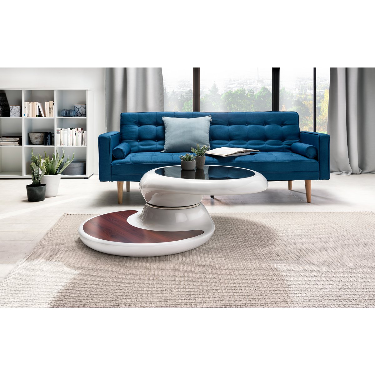 Deze moderne salontafel valt meteen op door zijn futuristische vorm. Functioneel meubilair is helemaal trendy, zo ook deze salontafel met een 360 graden draaibaar blad in wit. Het brengt nieuwe energie in je woonkamer en ziet er uiterst stijlvol uit. Hij biedt veel stijlvolle opbergruimte op twee niveaus. Het draaibare tafelblad in glaslook is uiterst praktisch in gebruik. Een stabiele basis zorgt voor stabiliteit. De salontafel is gemaakt van glasvezel en heeft een onderhoudsvriendelijk oppervlak. Je zult dit sieraad snel onder de knie krijgen. Glasvezel met hoogglanzend oppervlak, plaat 8 mm zwart.