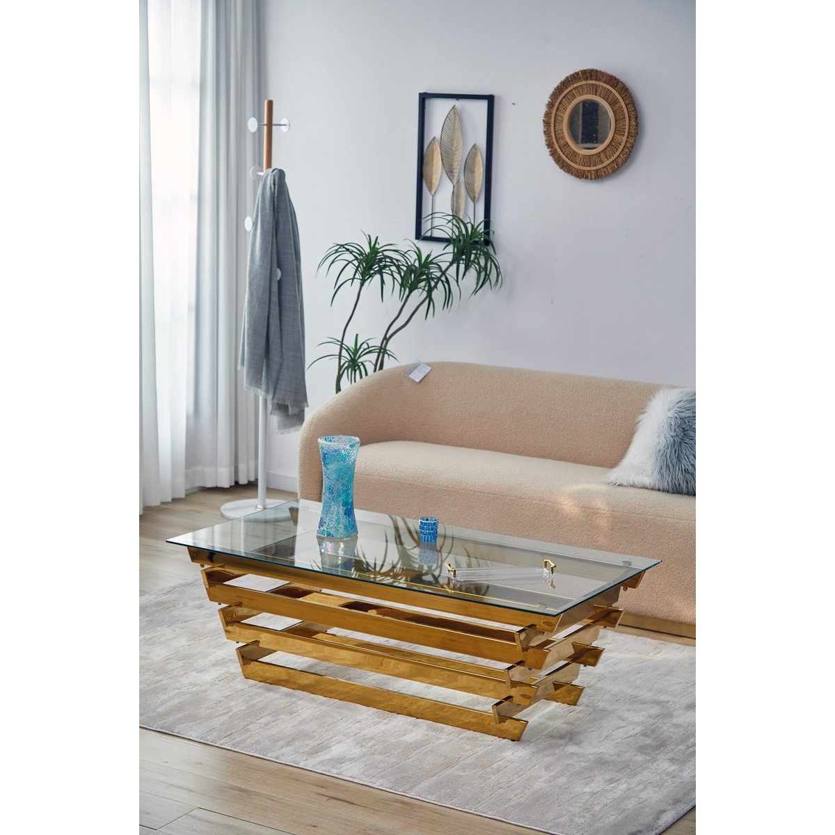 Deze elegante salontafel brengt pure glamour in het woongedeelte en is een verfijnde blikvanger in ieder interieur. Het opvallende designframe van duurzaam roestvrij staal in goudkleurige afwerking geeft de tafel een luxueuze en extravagante uitstraling. Door het bijzondere ontwerp met verspringende metalen elementen ontstaat een stijlvol geheel dat direct karakter toevoegt aan de woonkamer. De combinatie van goudkleurig metaal en helder glas laat zich bovendien harmonieus combineren met uiteenlopende kleuren en vormen van zitmeubelen.