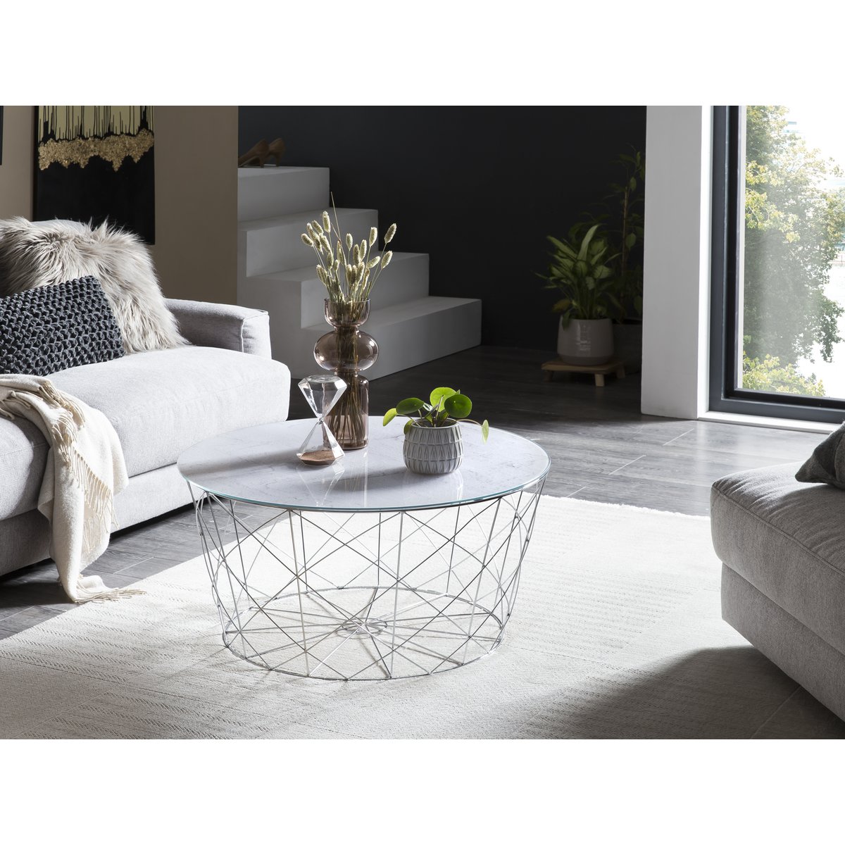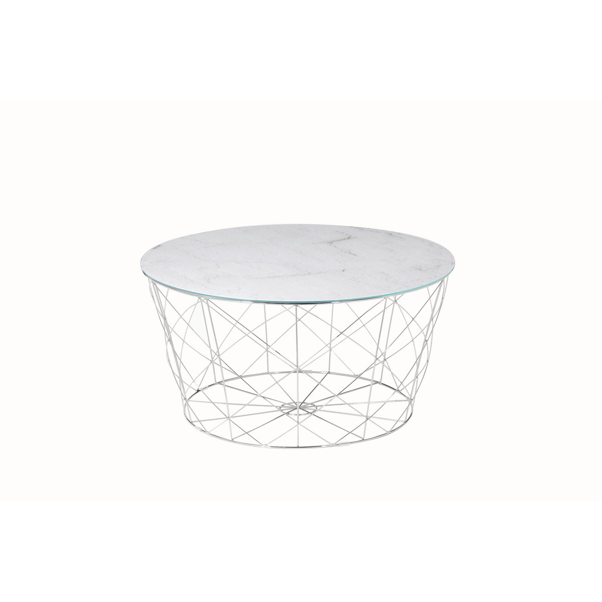 De ronde salontafel combineert modern design met een dosis extravagantie. Het glazen blad met daaronder een marmerlook folie past perfect bij het verchroomde metalen frame. De salontafel biedt voldoende opbergruimte voor bijvoorbeeld fruit, snacks of een bloemenvaas. Het frame kan gebruikt worden als opbergmand voor tijdschriften. Dankzij het aantrekkelijke design is deze salontafel met vele meubelstukken te combineren en vindt hij ook een geschikte plek in je huis. 6 mm dikke glasplaat met onderliggende folie in witte marmerlook, frame te gebruiken als opbergmand.