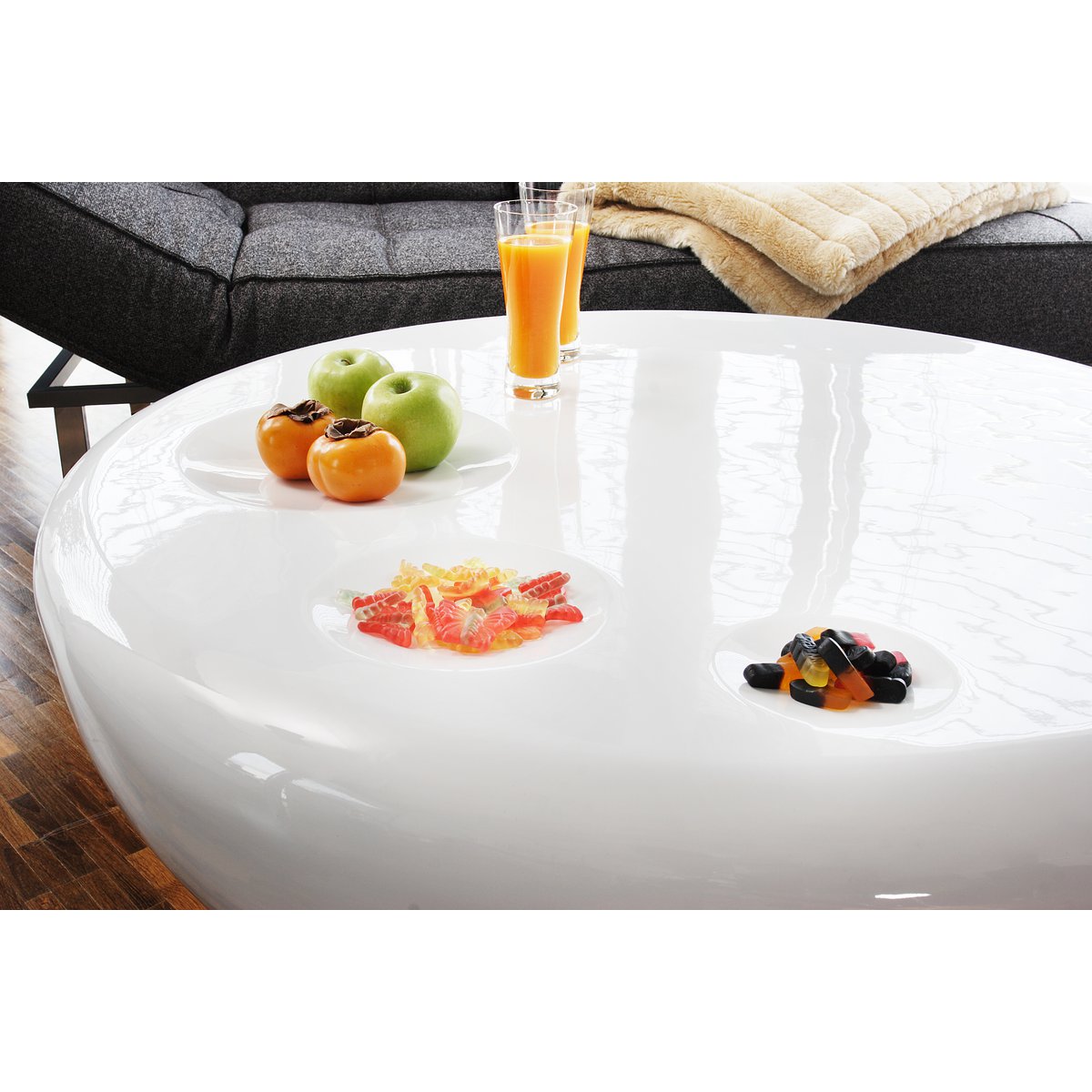Terug naar de jaren zeventig! De ronde salontafel maakt indruk met zijn retro-look. De gehele salontafel is gemaakt van hoogwaardig glasvezel en geschilderd in hoogglans wit. Het designstuk valt meteen op door zijn onconventionele vorm. Maar het praktische doel werd tijdens de productie niet genegeerd. In het tafelblad bevinden zich drie uitsparingen die gebruikt kunnen worden als praktisch plankje voor fruit of snacks. Met een diameter van 100 cm is er ook voldoende ruimte voor tijdschriften of afstandsbedieningen. Dankzij de ronde vorm loop je geen risico dat je tegen de hoeken botst. 3 uitsparingen in het tafelblad, Ø 100 cm.