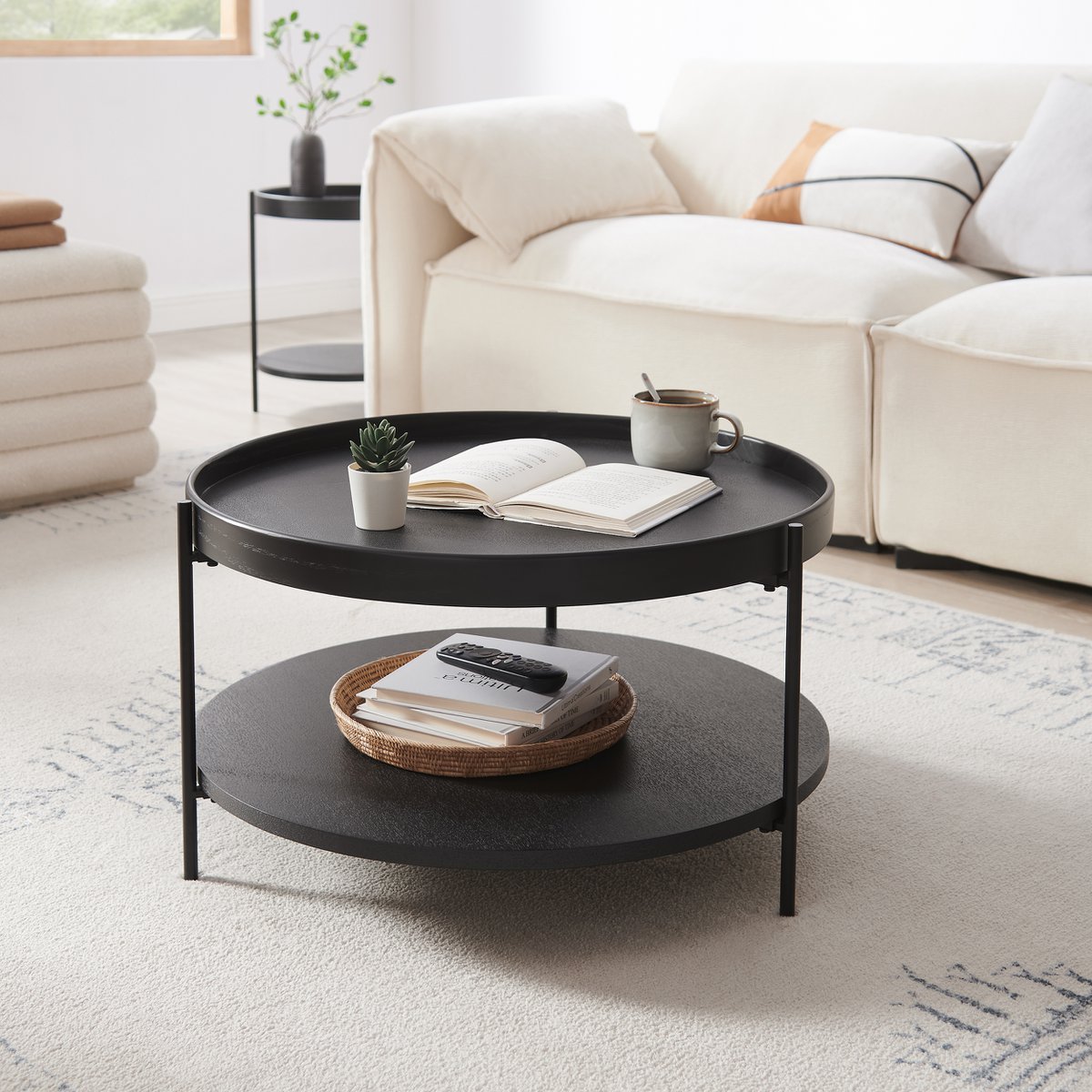 De salontafel met een diameter van 69 cm en twee planken is de ideale keuze voor iedereen die modern design wil combineren met praktische toepassingen. Met zijn doordachte design past hij moeiteloos in de meest uiteenlopende woonstijlen en overtuigt hij door zijn kwaliteit en esthetiek. De tafelbladen zijn gemaakt van vezelplaat met gemiddelde dichtheid (MDF) en zijn afgewerkt met aantrekkelijk essenhoutfineer, waardoor het oppervlak een warme, natuurlijke houtlook krijgt. Het lakwerk zorgt voor extra duurzaamheid en beschermt het materiaal tegen slijtage. Het frame is gemaakt van metaal en voorzien van een matte poedercoating, wat de tafel niet alleen een elegante uitstraling geeft, maar hem ook bestand maakt tegen krassen en gebruikssporen. Met zijn twee planken biedt de salontafel voldoende ruimte om boeken, tijdschriften, afstandsbedieningen of decoraties stijlvol en binnen handbereik te plaatsen. Dankzij zijn eenvoudige maar elegante uitstraling past deze salontafel in verschillende woonomgevingen, of deze nu minimalistisch, Scandinavisch of industrieel zijn. De materiaalmix van houtfineer en metaal geeft het een modern en tegelijkertijd natuurlijk karakter. Met een diameter van 69 cm is hij ruim genoeg voor dagelijks gebruik, maar blijft hij toch compact en flexibel. Tafelbladen: vezelplaat van gemiddelde dichtheid (MDF) met essenhoutfineer, geverfd, frame: metaal, mat gepoedercoat