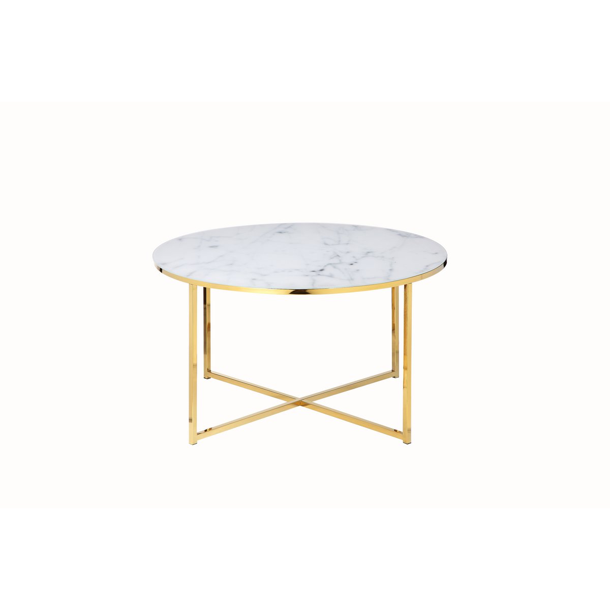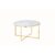 De ronde salontafel combineert modern design met een dosis extravagantie. Het glazen blad met daaronder een marmerlook folie past perfect bij het goudkleurige metalen frame. De salontafel biedt voldoende opbergruimte voor tijdschriften, fruit, snacks of een bloemenvaas. Dankzij het aantrekkelijke design en de ronde vorm is deze salontafel met vele meubelstukken te combineren en vindt hij ook een geschikte plek in je huis. 6 mm dik glasblad met onderliggende folie in wit marmerlook, diameter van het tafelblad Ø 80 cm.