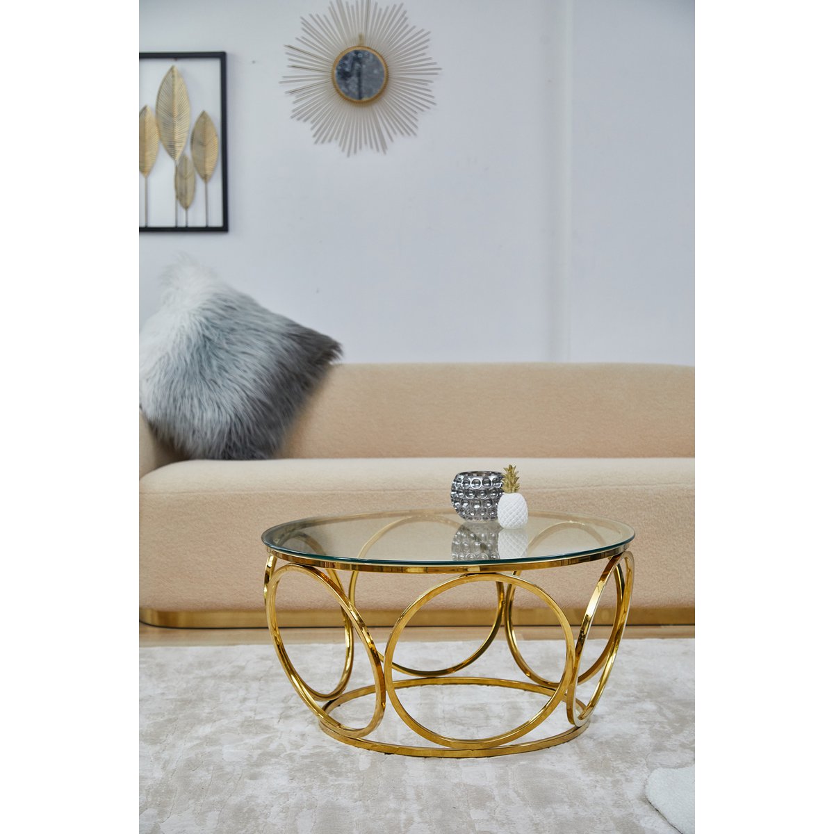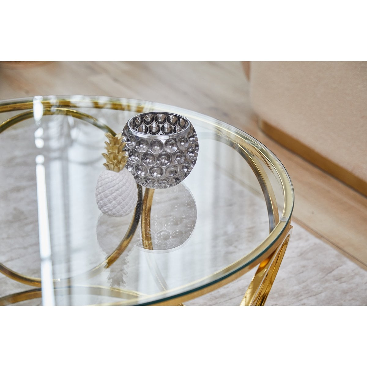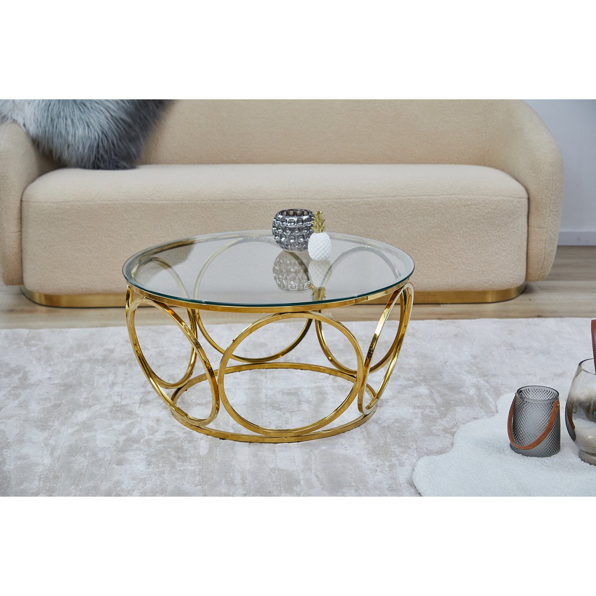 Deze elegante salontafel straalt pure glamour uit in het woongedeelte. De blikvanger van de tafel is het extravagante designframe van duurzaam roestvrij staal in goudkleurige afwerking. Het frame van ronde metalen ornamenten ziet er indrukwekkend uit en wordt een elegant middelpunt in de woonkamer. Passend bij alle kleuren en vormen van gestoffeerde meubels, past de salontafel in goud en helder glas harmonieus in vele woonstijlen. Dankzij het blad van 8 mm veiligheidsglas heeft de tafel een hoge slagvastheid en is breukvast. Het oppervlak van de glasplaat en het frame is bovendien bijzonder onderhoudsvriendelijk en kan eenvoudig met een vochtige doek worden afgeveegd. Deze salontafel brengt een stukje extravagantie in uw vier muren. Bladdikte 8 mm, blad van veiligheidsglas, frame van roestvrij staal/roestvrij staal in gouden afwerking, max. draagvermogen ca. 50 kg.