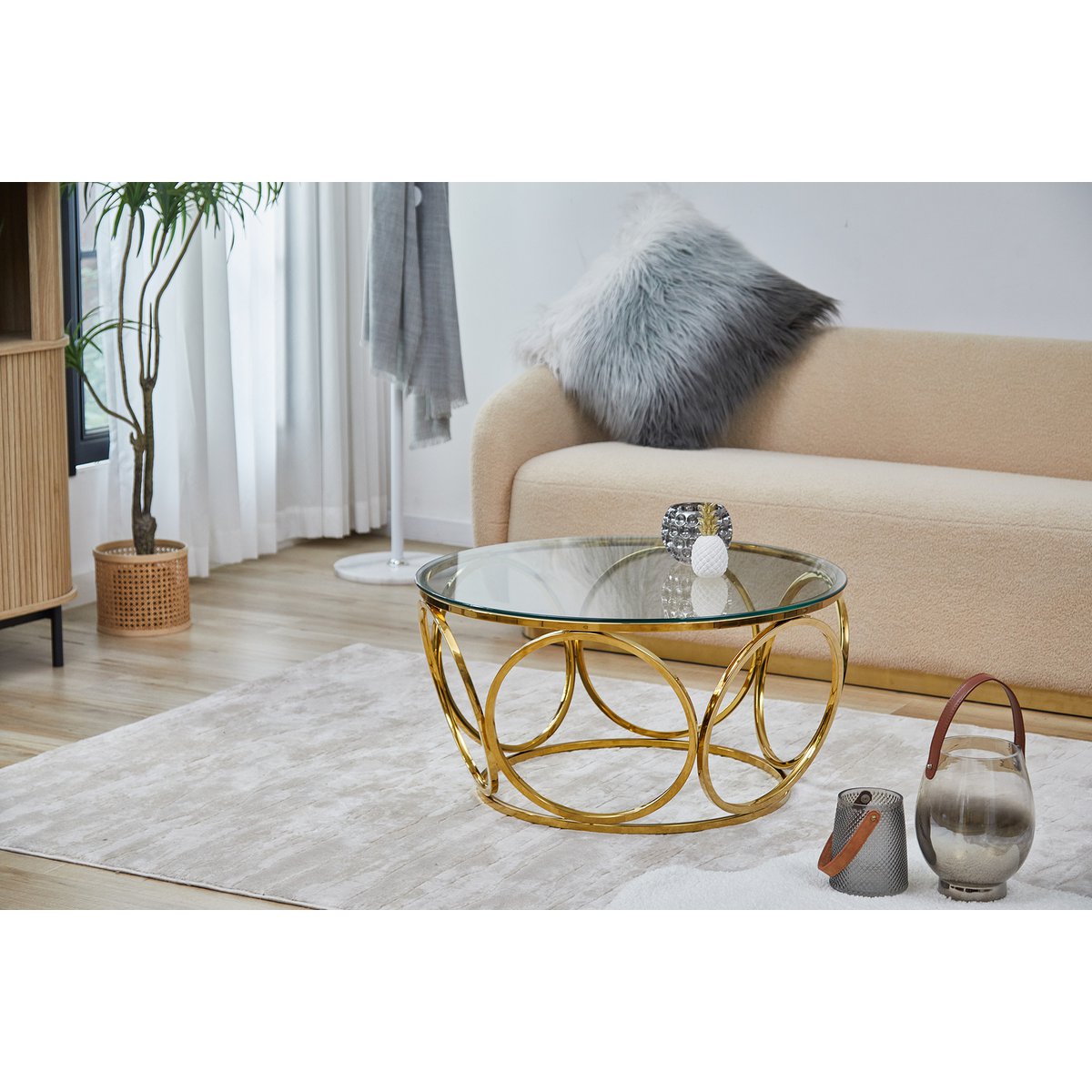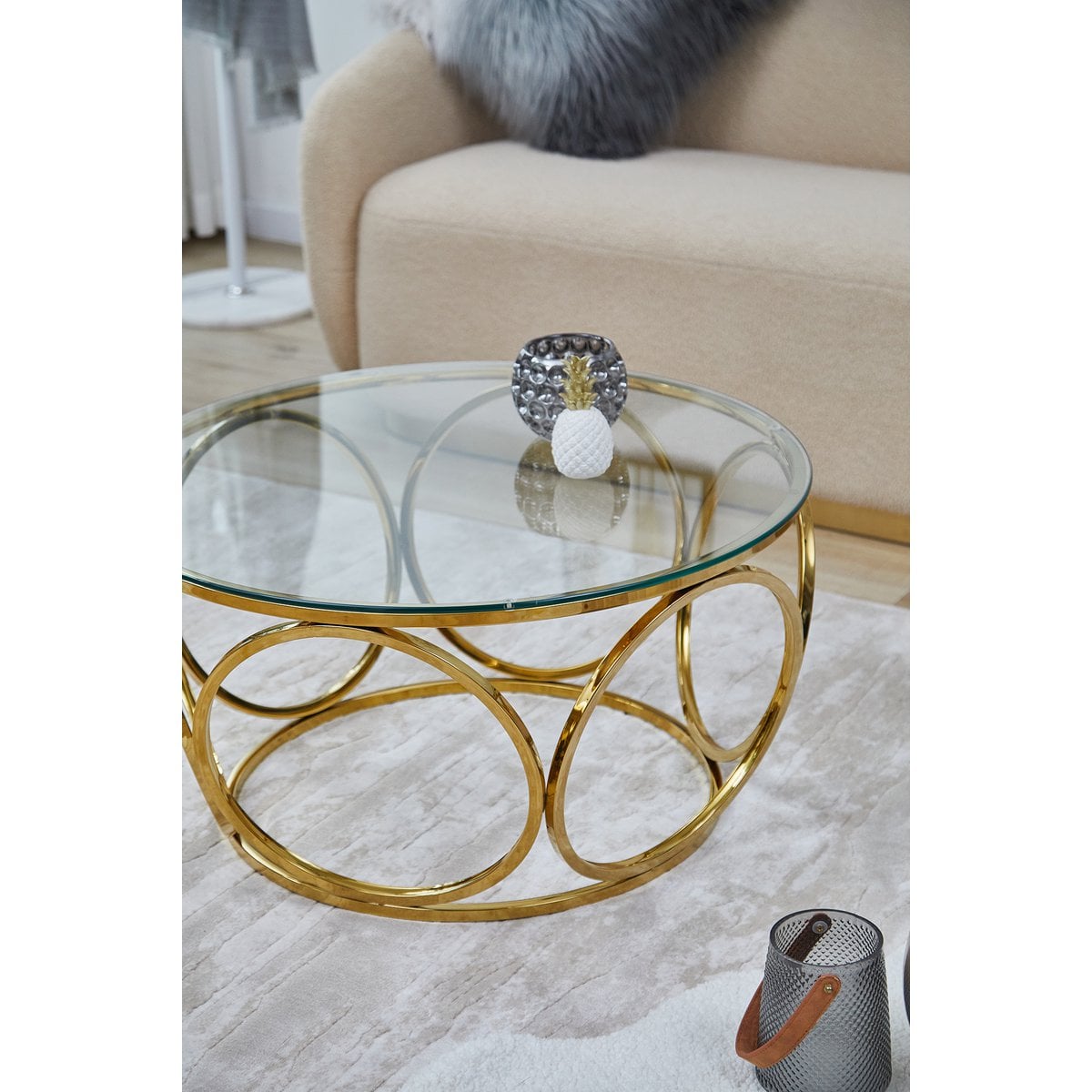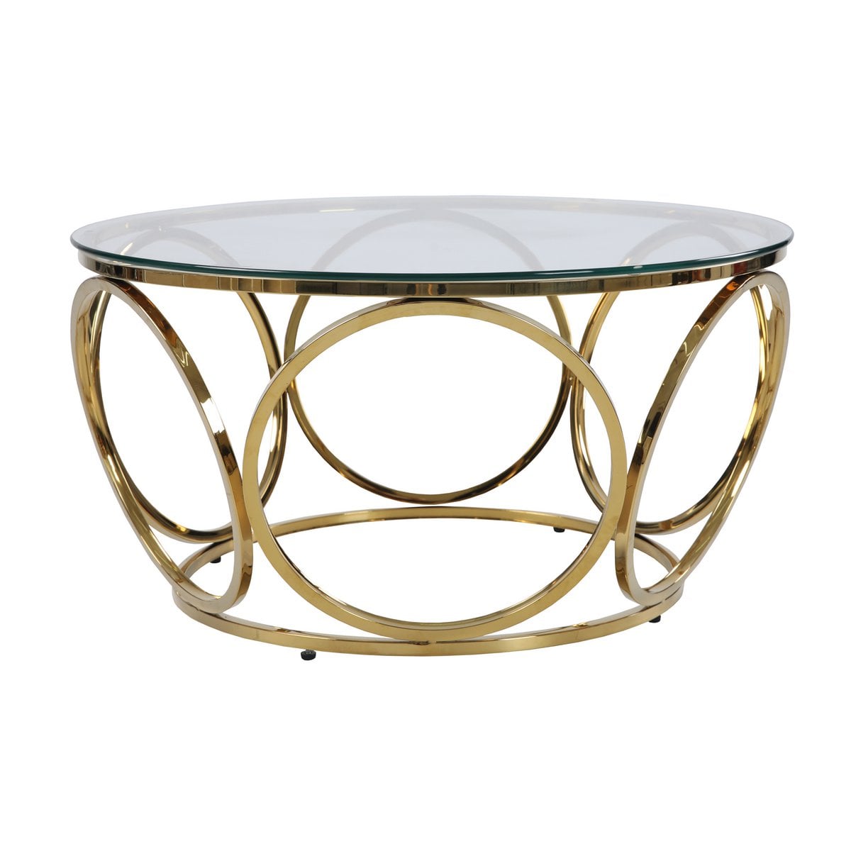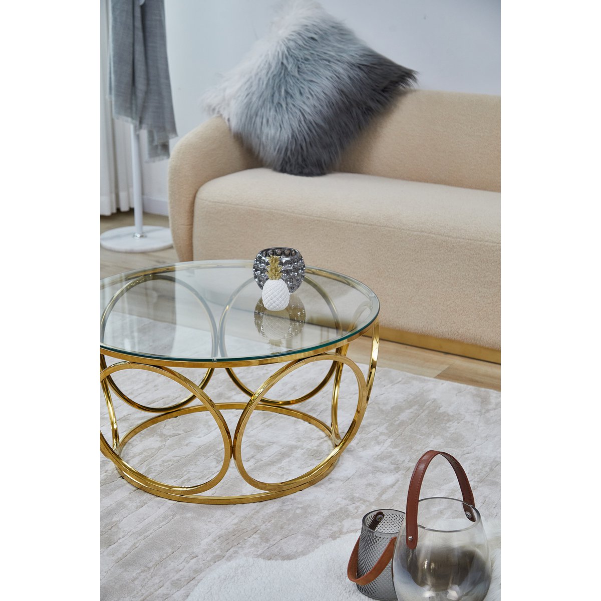 Deze elegante salontafel straalt pure glamour uit in het woongedeelte. De blikvanger van de tafel is het extravagante designframe van duurzaam roestvrij staal in goudkleurige afwerking. Het frame van ronde metalen ornamenten ziet er indrukwekkend uit en wordt een elegant middelpunt in de woonkamer. Passend bij alle kleuren en vormen van gestoffeerde meubels, past de salontafel in goud en helder glas harmonieus in vele woonstijlen. Dankzij het blad van 8 mm veiligheidsglas heeft de tafel een hoge slagvastheid en is breukvast. Het oppervlak van de glasplaat en het frame is bovendien bijzonder onderhoudsvriendelijk en kan eenvoudig met een vochtige doek worden afgeveegd. Deze salontafel brengt een stukje extravagantie in uw vier muren. Bladdikte 8 mm, blad van veiligheidsglas, frame van roestvrij staal/roestvrij staal in gouden afwerking, max. draagvermogen ca. 50 kg.