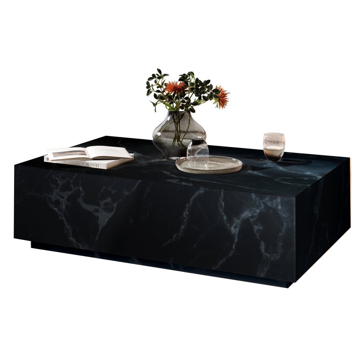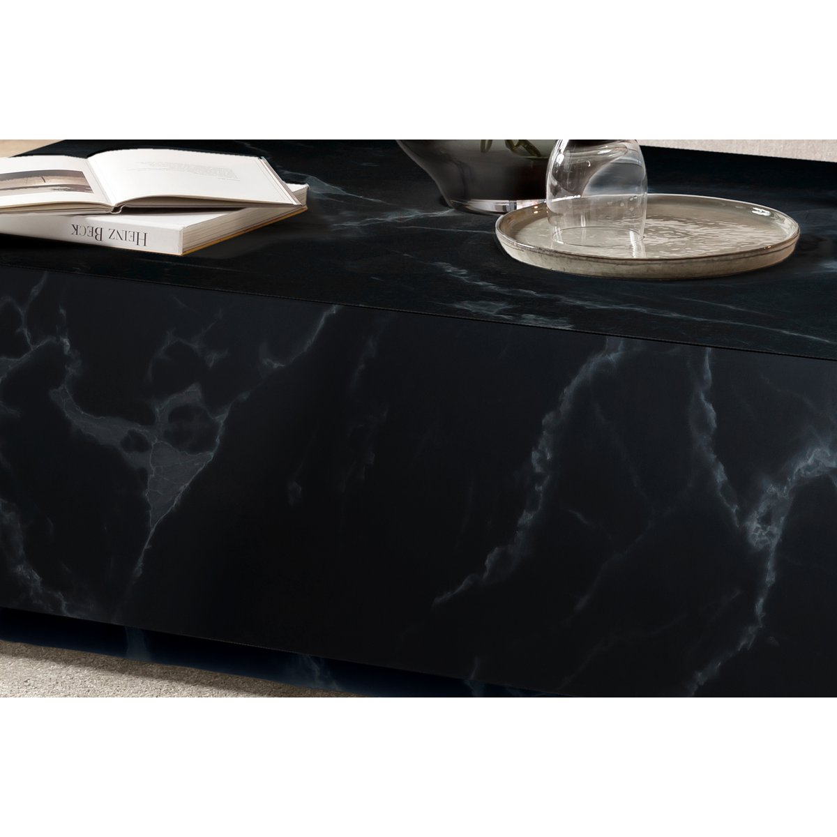 Deze chique salontafel laat je woonkamer er veel eleganter uitzien. De eenvoudige kubusvorm met veel oppervlak brengt de geweldige zwarte marmerlook naar voren. De lage hoogte tovert een modern loungekarakter in uw woning. Beplakt met melaminefolie in marmerlook, afmetingen voet: ca. 104x59x6 cm.