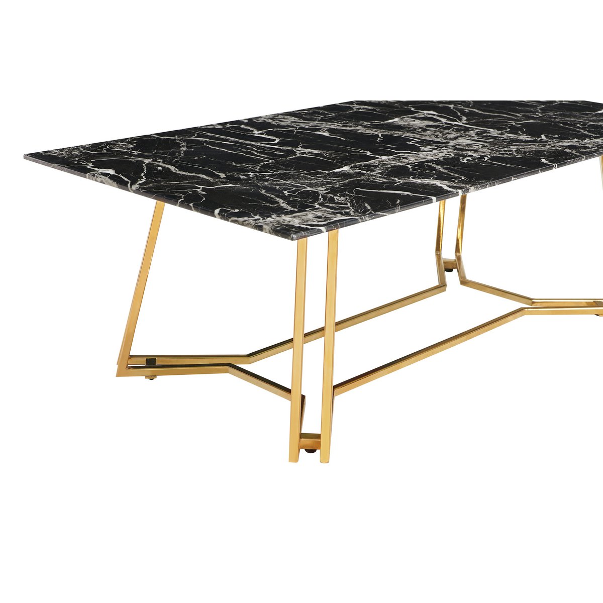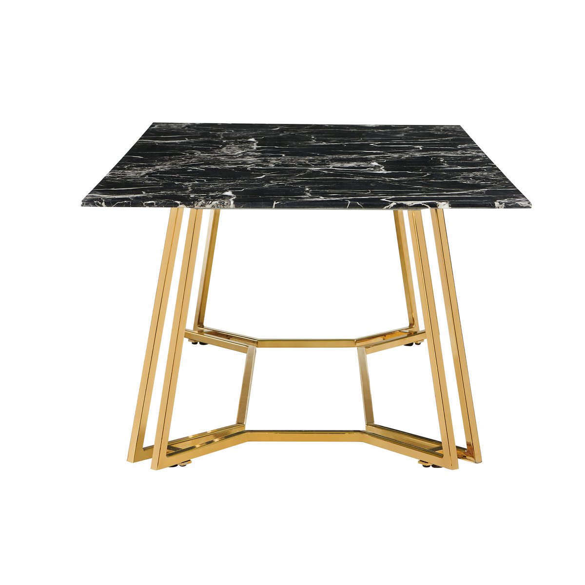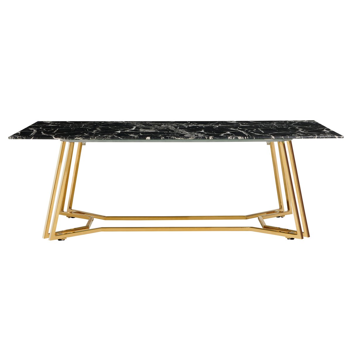 Deze chique salontafel geeft de woonkamer direct een luxe en moderne uitstraling. Het tafelblad van zwart veiligheidsglas met marmerlook vormt samen met het goudkleurige metalen frame een elegante combinatie die perfect aansluit bij hedendaagse woonstijlen.