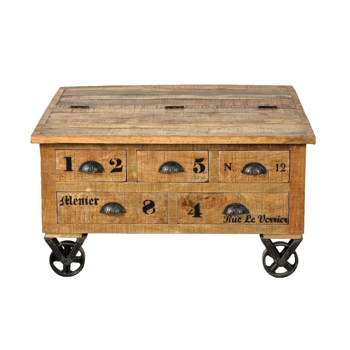 Deze praktische salontafelkist in rustiek design combineert karakter, opbergruimte en flexibiliteit in één opvallend meubelstuk. De warme kleur van het gelakte mangohout vormt een stijlvol contrast met het antiek zwarte metalen beslag en de print in containerbox-stijl. Dankzij de subtiele handgrepen en de grote wielen krijgt deze salontafel een krachtige industriële uitstraling die perfect past in een stoer en sfeervol interieur.