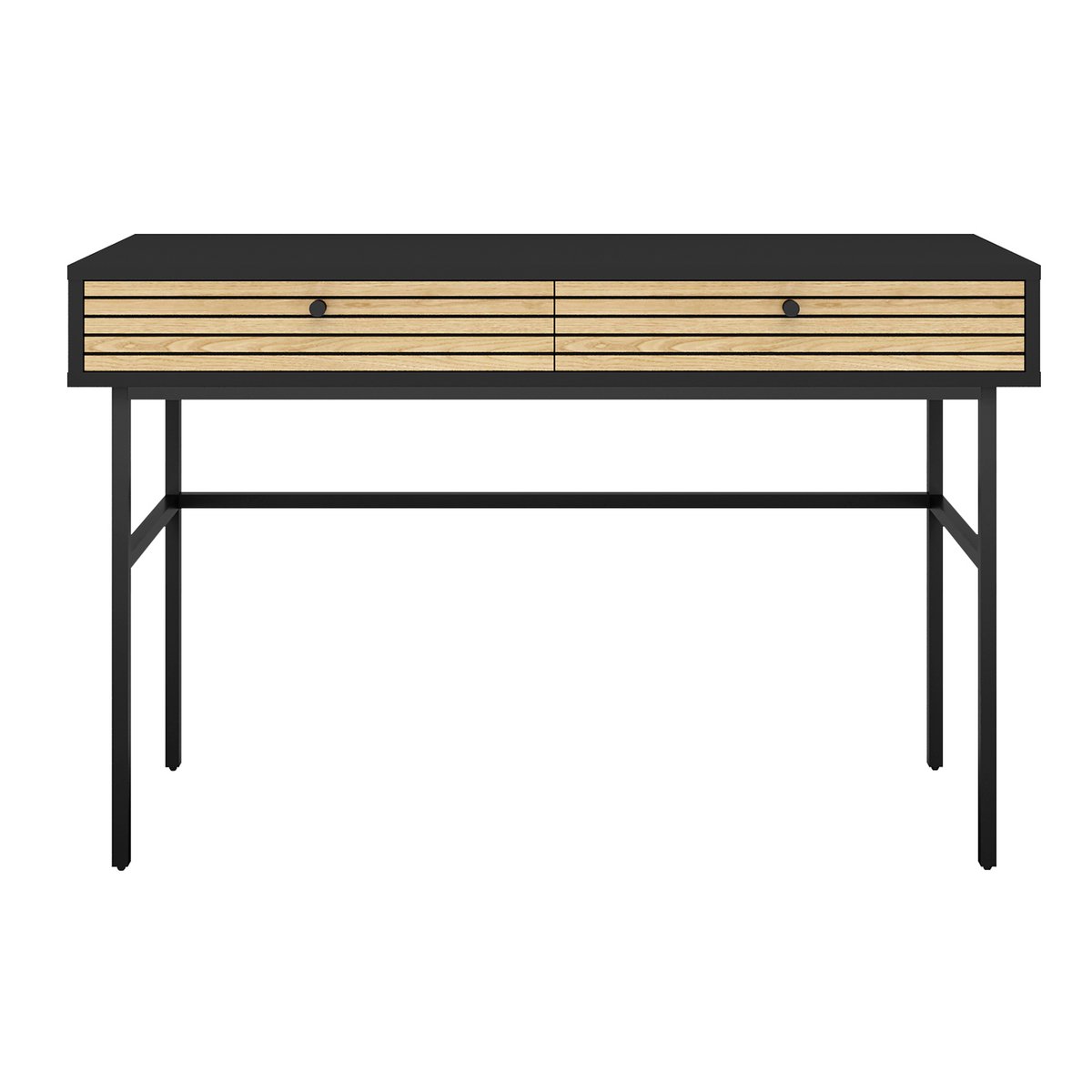 Met twee lades biedt het bureau praktische opbergruimte voor schrijfwaren en andere dagelijkse benodigdheden. Het matzwart gepoedercoate frame zorgt voor een stevige basis en geeft het meubel een strakke, eigentijdse uitstraling.