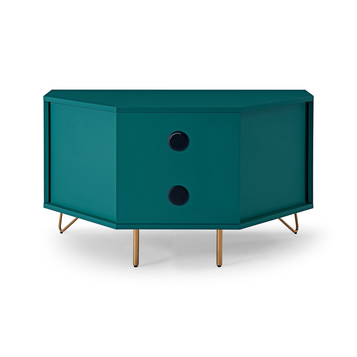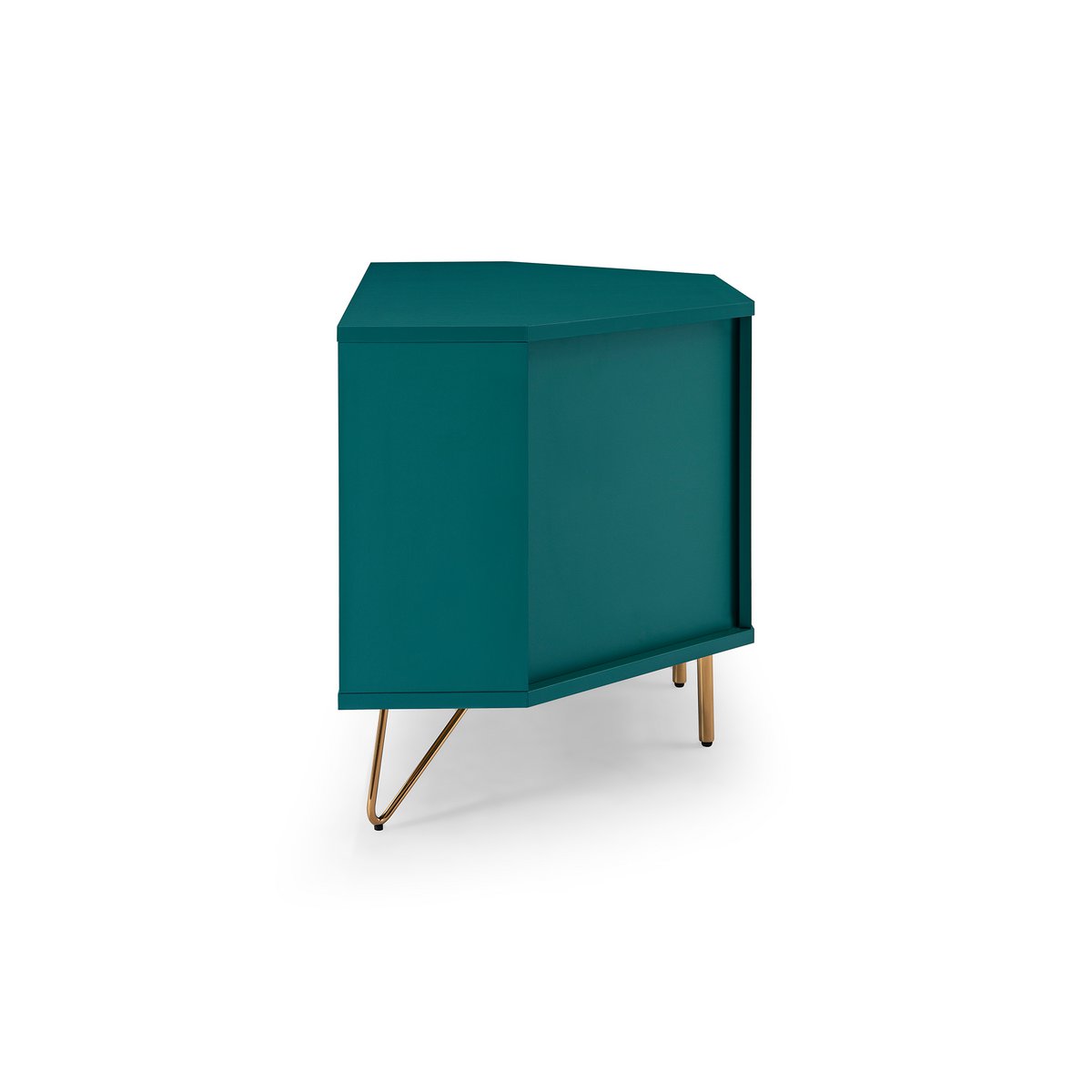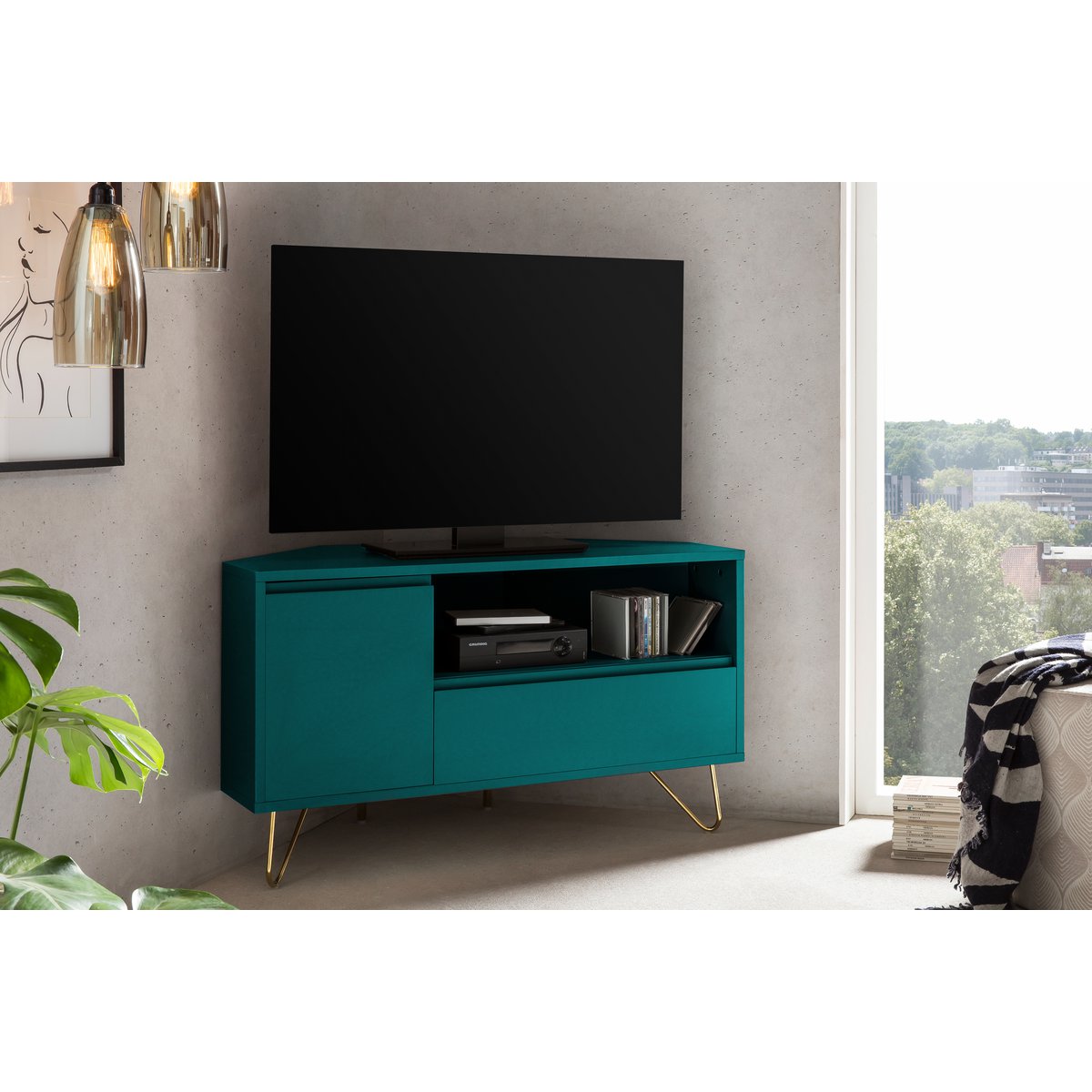 Dit hoek-tv-lowboard in Scandinavisch design is een echte eyecatcher in de woonkamer. De combinatie van de eenvoudige blauwe kleur met goudkleurige metalen poten geeft dit tv-meubel een elegante en moderne uitstraling. Dankzij het slimme hoekontwerp is dit meubel ideaal om een hoek stijlvol en praktisch te benutten.