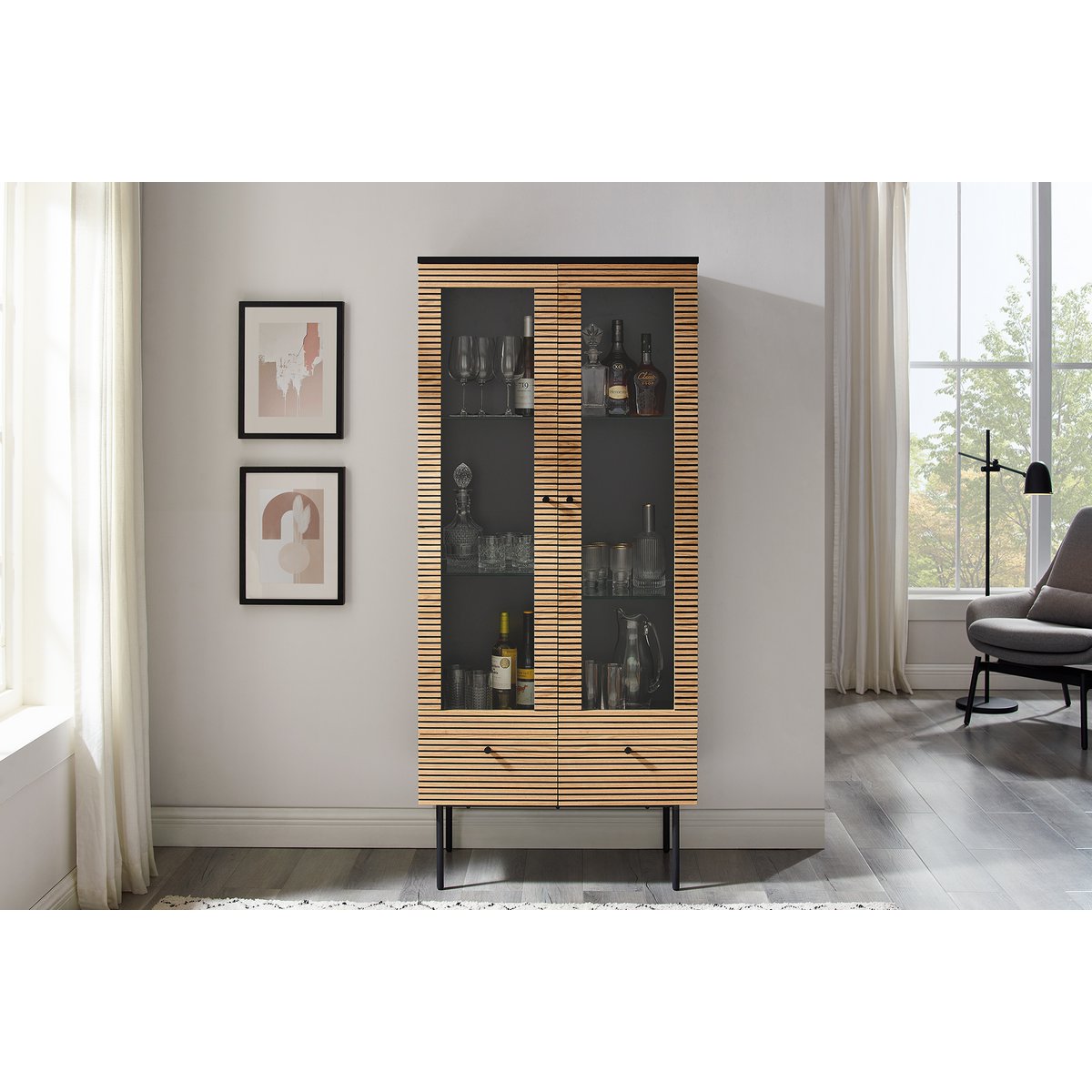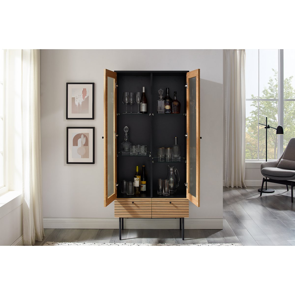 Deze vitrinekast biedt een mooie combinatie van Scandinavische eenvoud en moderne elegantie. De warme uitstraling van echt eikenfineer contrasteert stijlvol met de donkere binnenzijde en het slanke zwarte metalen onderstel, waardoor het meubel een luchtige en verfijnde uitstraling krijgt.