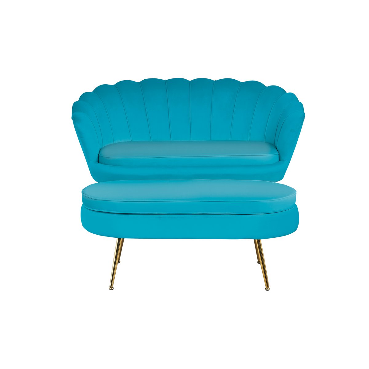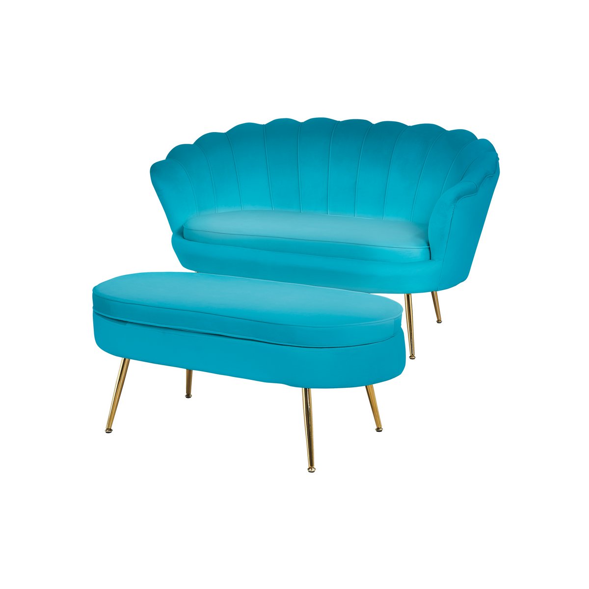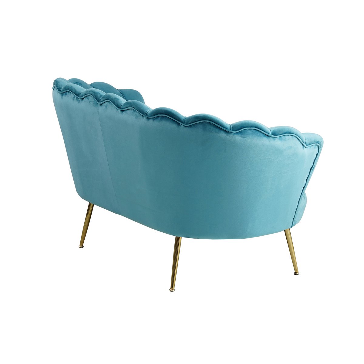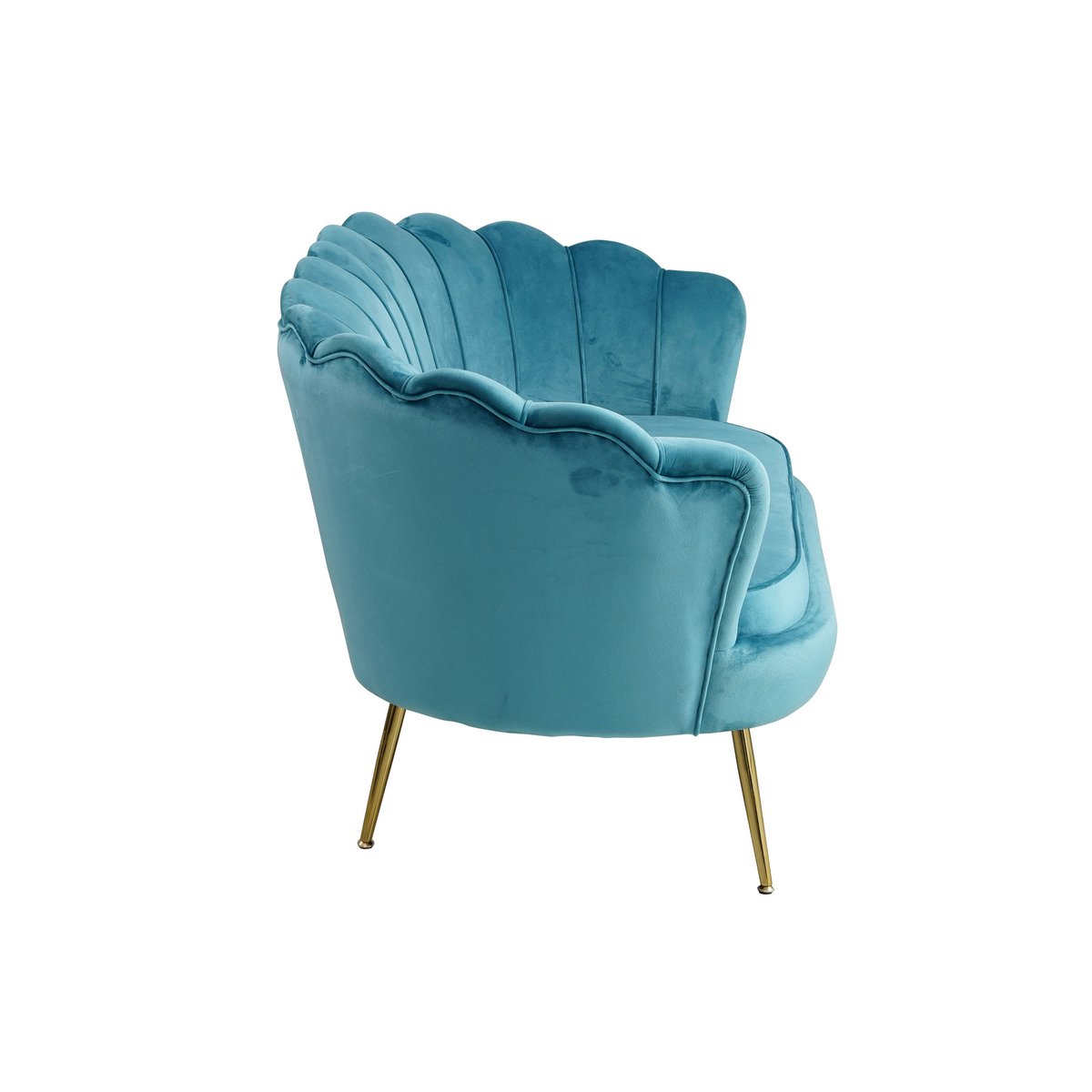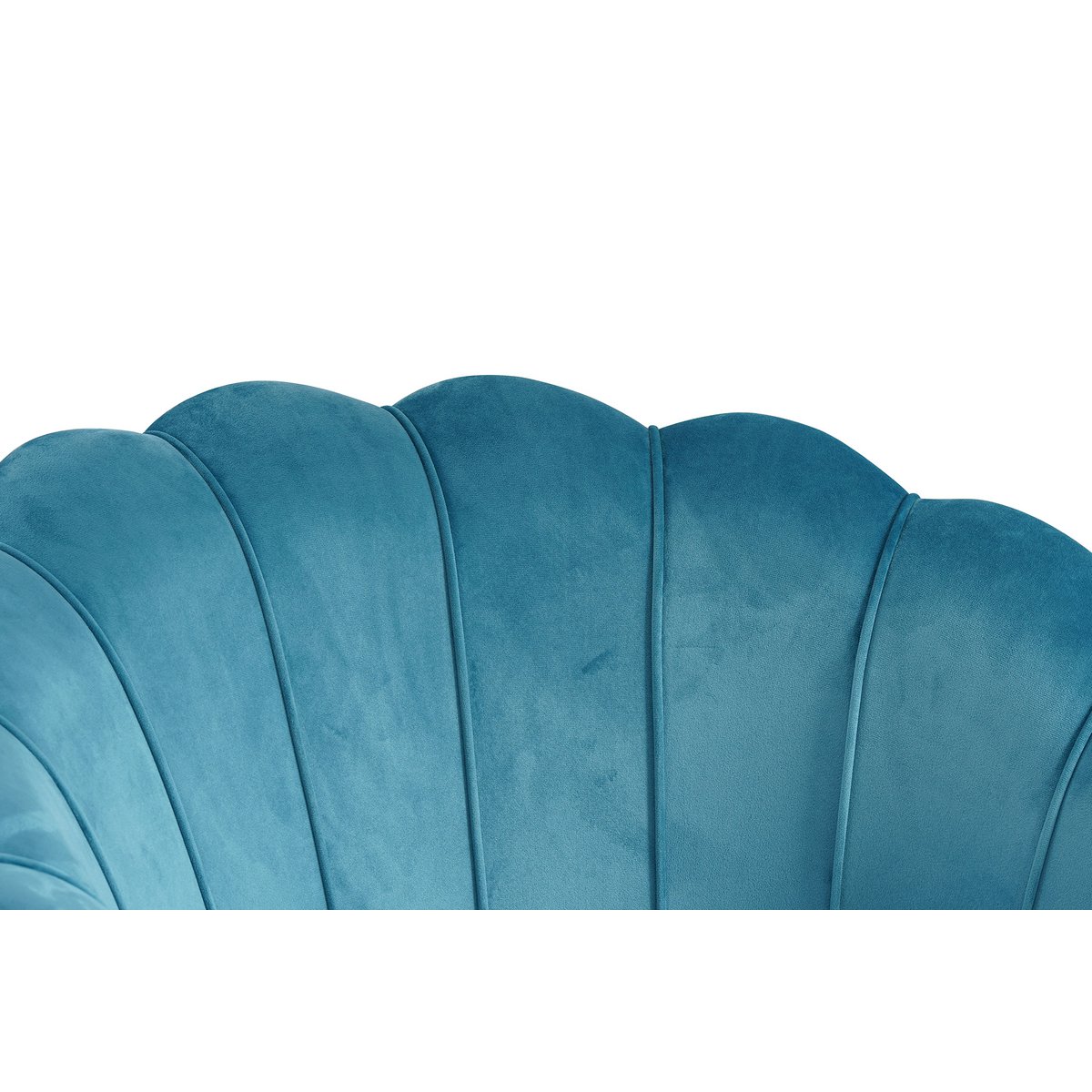 Deze moderne schaalbank combineert comfort, elegantie en een luxe uitstraling in één opvallend meubelstuk. De stijlvolle stoffen bekleding met fluwelen look in blauw vormt een prachtig contrast met het hoge goudkleurige metalen frame, waardoor de bank direct een chique en sfeervolle toevoeging is aan uw interieur. De ronde vorm, het afgeronde zit- en ruggedeelte en het meegeleverde hoge zitkussen zorgen voor een zachte en uitnodigende uitstraling.