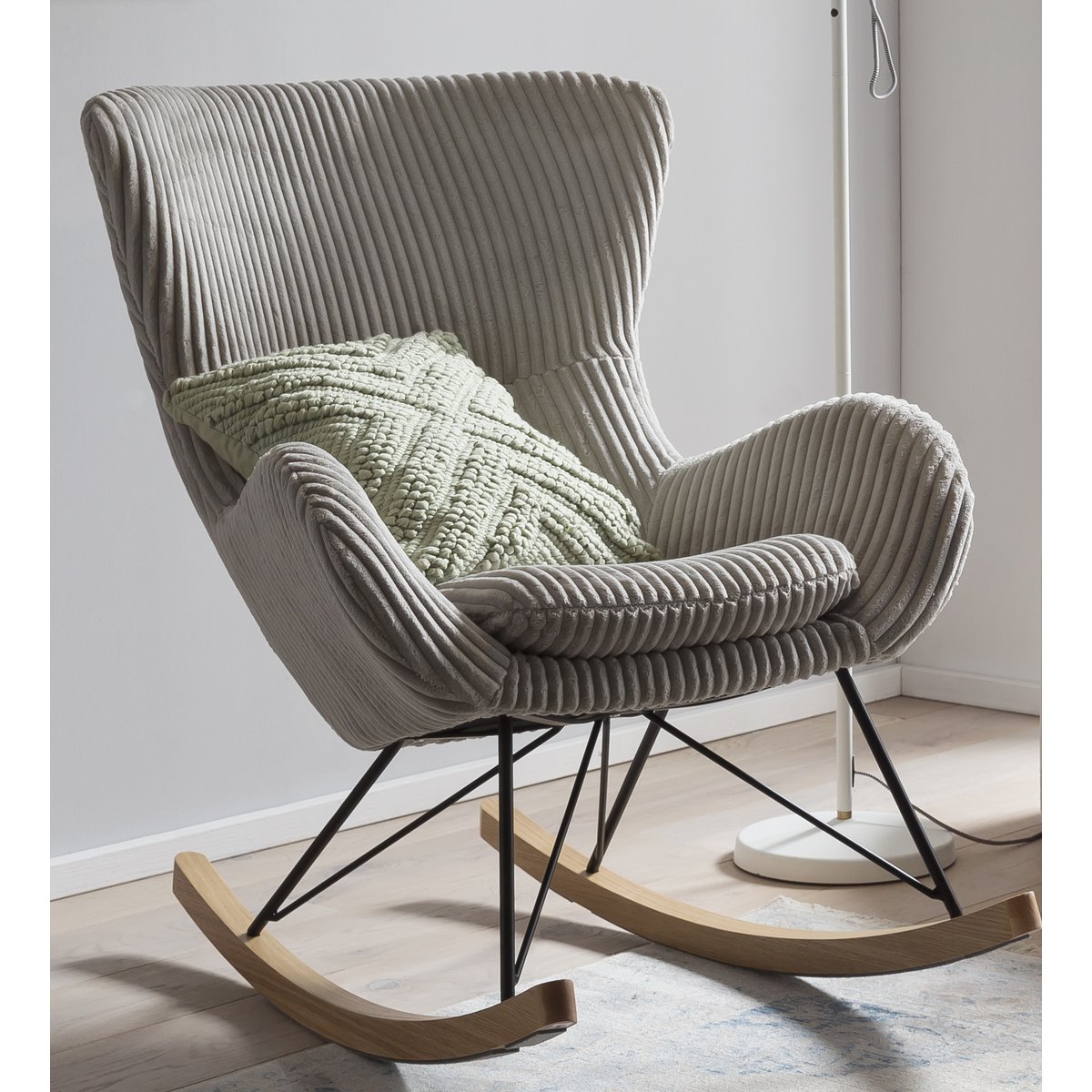Interieurmeubels van structuurstof zijn een gezellige woontrend die de woonruimtes van designliefhebbers verovert! De schommelstoel in Scandinavische stijl maakt indruk met zijn prachtige, gestructureerde stoffen bekleding in grijs. Terwijl het frame is gemaakt van zwart gepoedercoat metaal, zijn de twee lopers gemaakt van massief essenhout met eikenfineer. Dit frame zorgt niet alleen voor een gelijkmatige gewichtsverdeling en een mooie beweging van de stoel, maar harmonieert ook perfect met de stoffen bekleding. Dankzij de comfortabele vulling, de armleuningen en het extra dikke zitkussen ervaar je ontspanning en comfort van een klasse apart. De schommelstoel scoort door zijn opvallende uiterlijk, kwaliteit en duurzaamheid. Maak van deze schommelstoel je nieuwe favoriete plek en geniet van het comfort tijdens het lezen of tv kijken. Zitbreedte ca. 42 cm, zithoogte ca. 46 cm, hoogte van de armleuningen ca. 61 cm, afneembaar zitkussen, 100% polyester, lichtsterkte hoes: 4, slijtvastheid: 40.000.