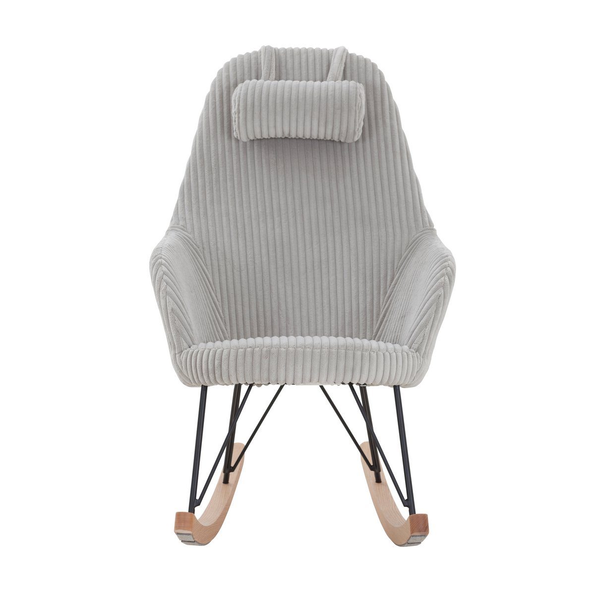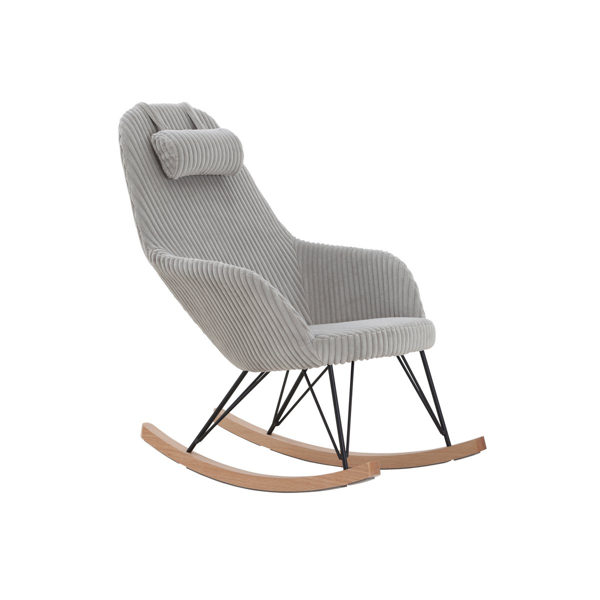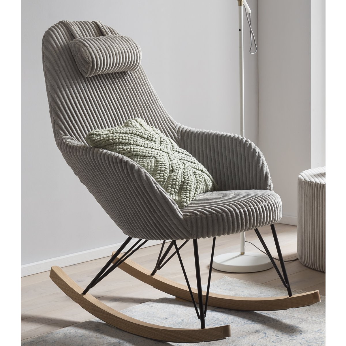 De schommelstoel in Scandinavische stijl is uitgerust met een verplaatsbaar kussen. De grijze hoes van hoogwaardige structuurstof biedt je een stijlvolle plek om te zitten en je goed te voelen. Terwijl het frame is gemaakt van zwart gepoedercoat metaal, zijn de gebogen lopers gemaakt van massief essenhout met eikenfineer. Dit frame zorgt niet alleen voor een gelijkmatige gewichtsverdeling en een mooie beweging van de stoel, maar harmonieert ook perfect met de textielbekleding. Dankzij de stoffering, de armleuningen en de hoofd- en zitkussens ervaar je ontspanning en comfort van een klasse apart. De schommelstoel scoort door zijn opvallende uiterlijk, kwaliteit en duurzaamheid. Maak van deze schommelstoel je nieuwe favoriete plek en geniet van het comfort tijdens het lezen of tv kijken. Zithoogte: ca. 46 cm, zitbreedte: ca. 45 cm, zitdiepte: ca. 53 cm, max. draagvermogen ca. 100% polyester : 40.000.