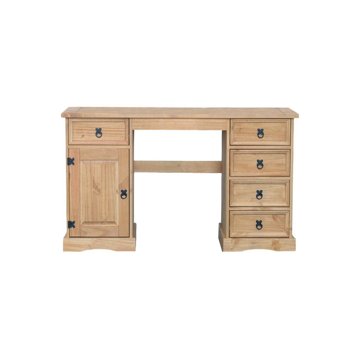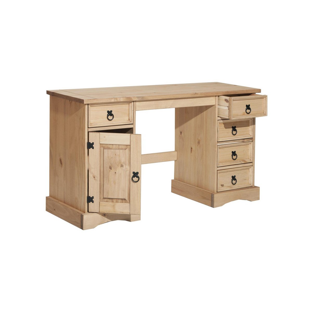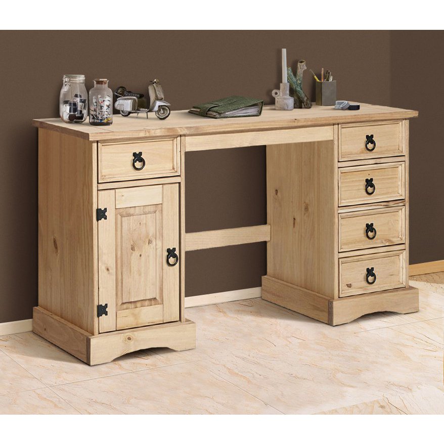 Die Schreibtisch gesorteerd met 5 Schubladen en een Schrankfach met Tür für erstaunlich viel Stauraum. De enorme Kiefer trotzt zdem erfolgreich dem altäglichen Gebrauch en der verdomde verbundenen Abnutzung. Der Schreibtisch überzeugt außerdem mit seinem zurückhaltenden Design en seiner kompakten Größe.