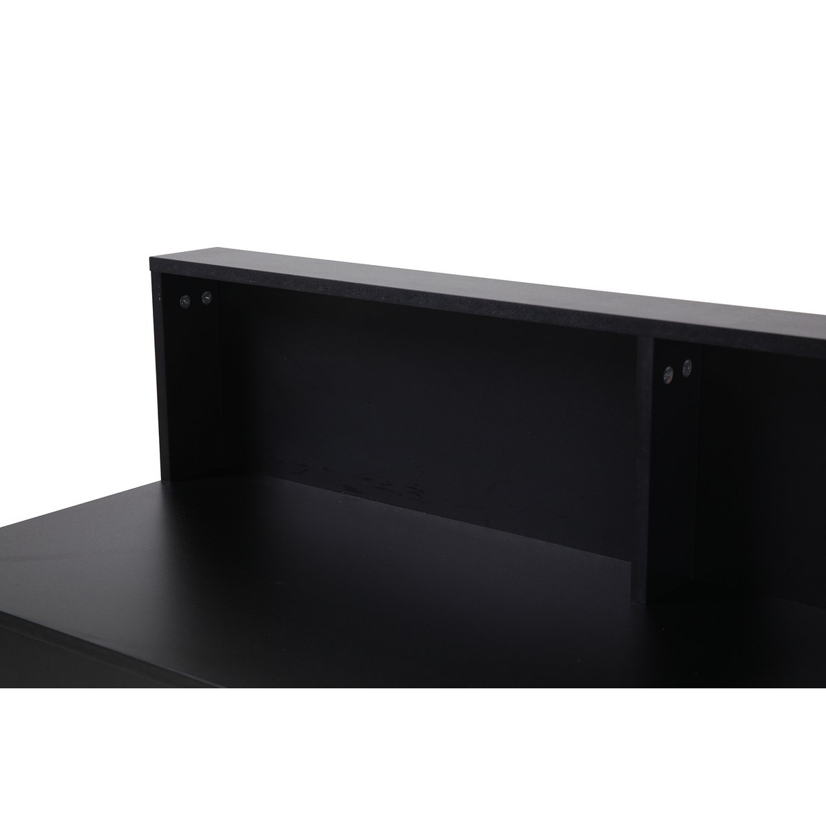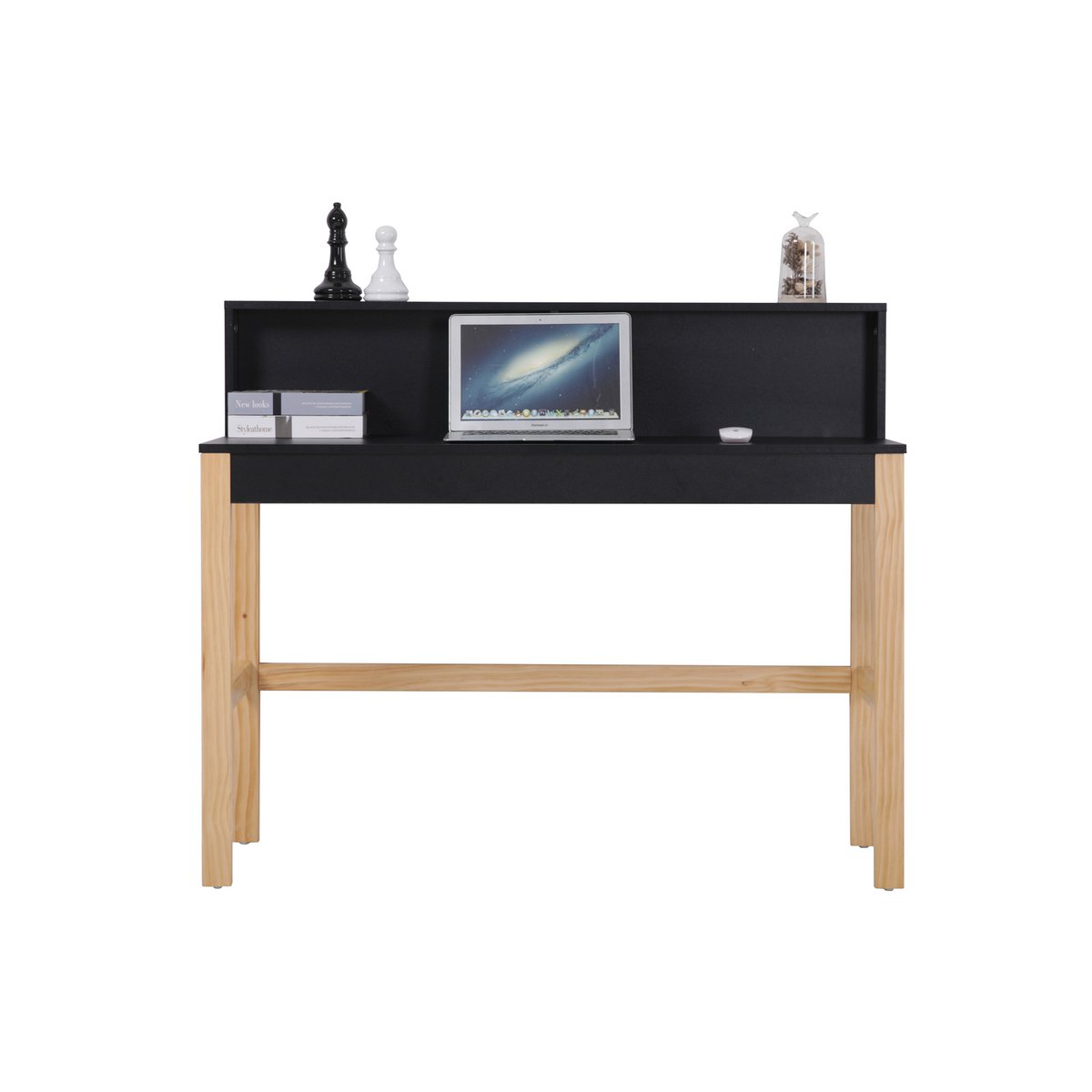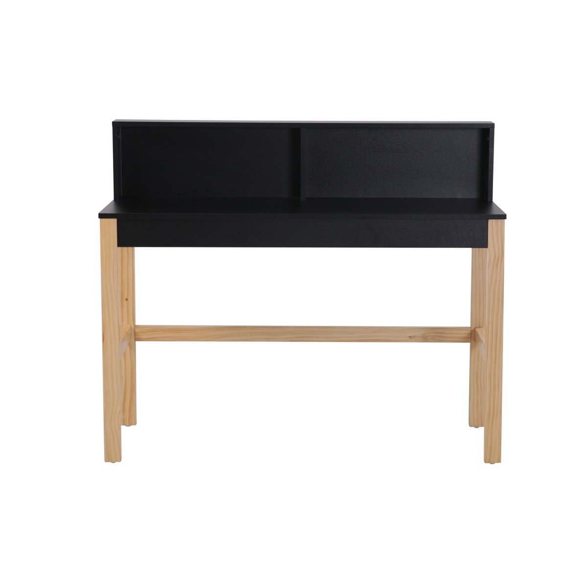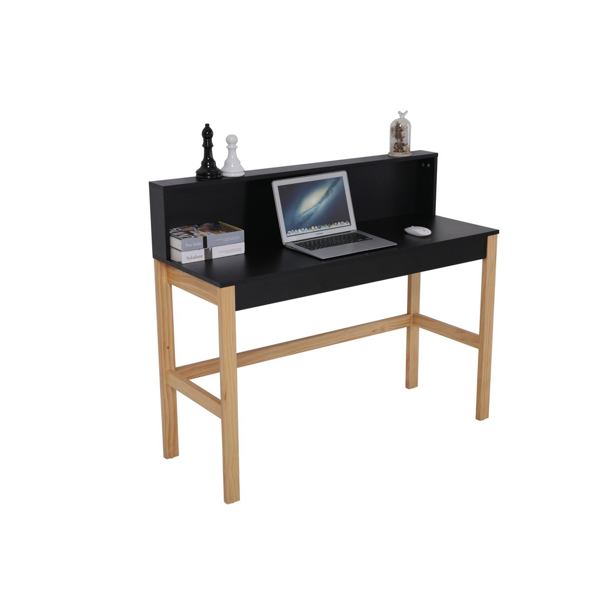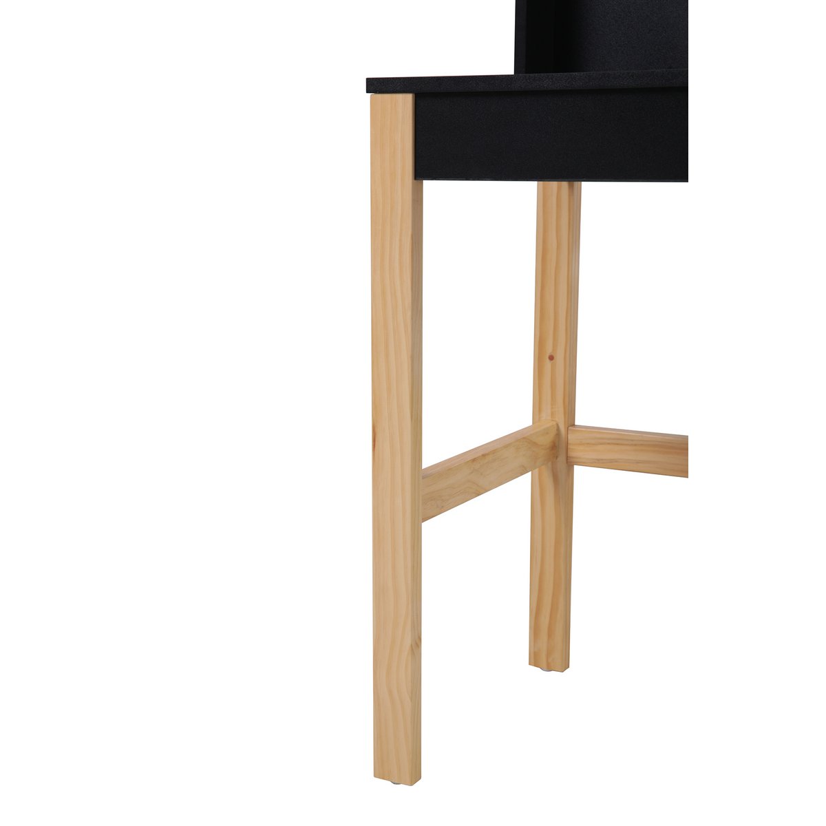 Dit zwarte bureau is een eyecatcher dankzij het contrast met de lichthouten poten. Een praktische bevestiging creëert een rand aan de muur zodat er geen onderdelen achter kunnen vallen.