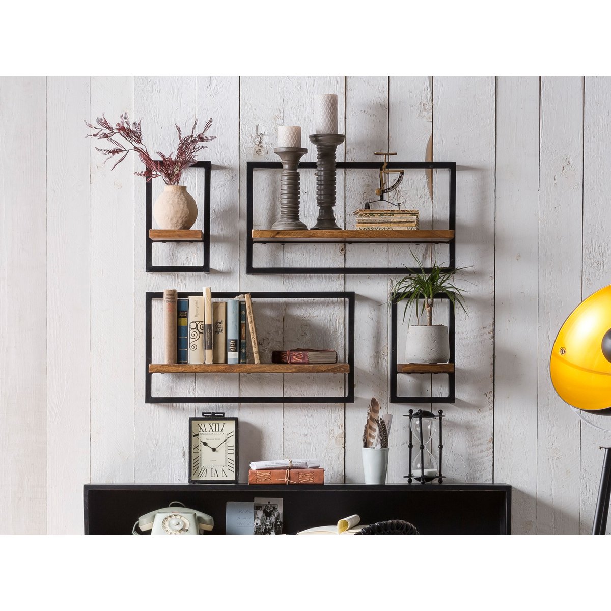 De set bestaat uit vier losse planken in twee verschillende formaten. De stevige combinatie van hout en metaal zorgt voor een duurzame en stabiele constructie, waardoor de planken niet alleen decoratief maar ook functioneel zijn.