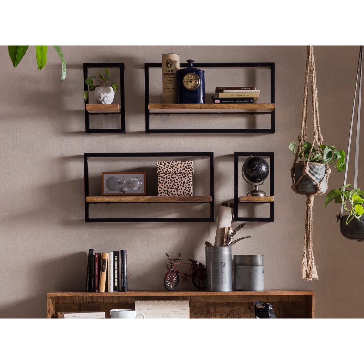 Deze set van 4 wandplanken combineert warm mangohout met een metalen frame met antieke biezen en brengt daarmee direct karakter in uw interieur. De natuurlijke houtkleur in combinatie met het donkere metaal zorgt voor een stoere en sfeervolle uitstraling die perfect past in industriële, landelijke en moderne woonstijlen. Door de verschillende formaten ontstaat een speels geheel aan de muur.