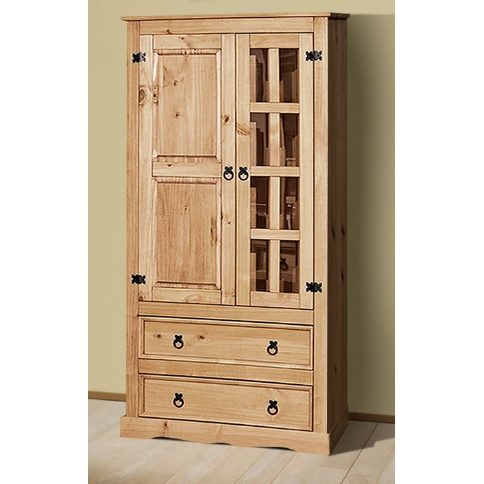 Deze tijdloze vitrinekast is gemaakt van massief grenen in een rustieke stijl. Het oppervlak is gewaxt in een warme honingtint. De ladekast biedt veel opbergruimte in 2 lades en achter 2 deuren met in totaal 5 planken. De plint heeft een gebogen vorm. De massief houten meubelen van Dias zijn een absolute eyecatcher voor je woon- en eetkamer. De zwart gelakte metalen decoraties geven deze vitrine net dat beetje extra.