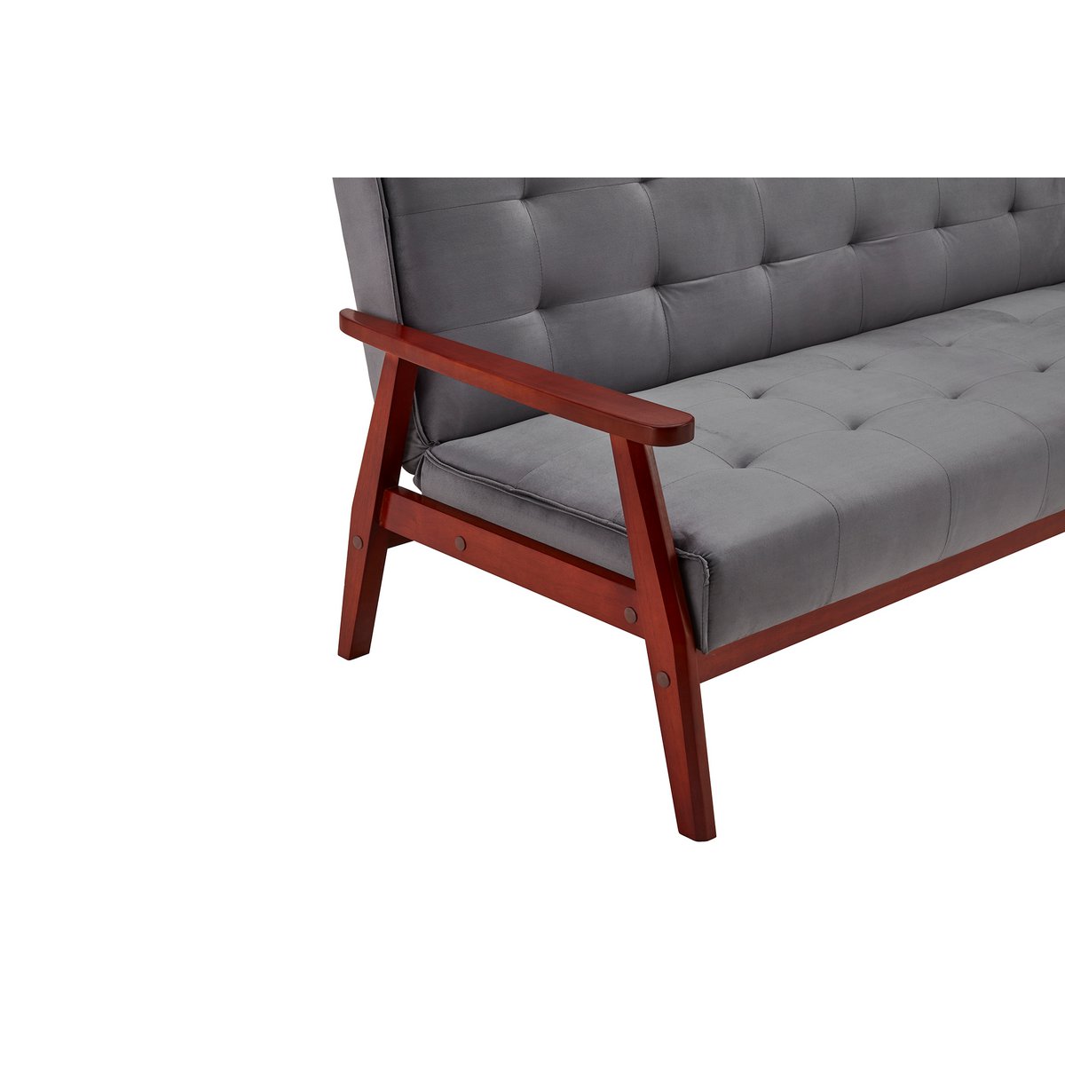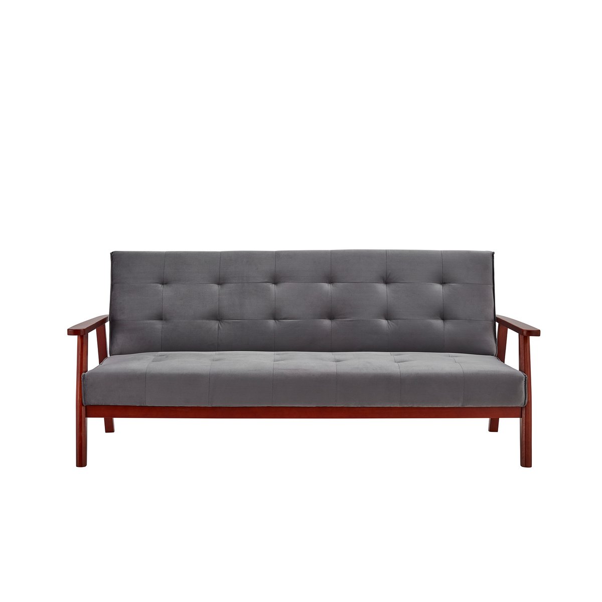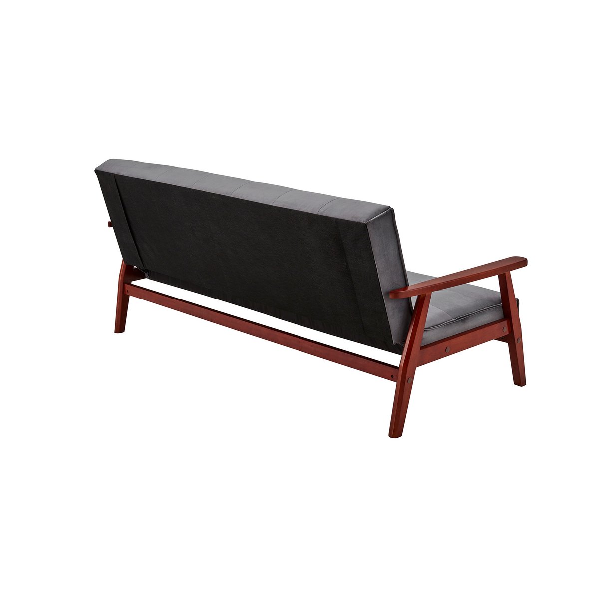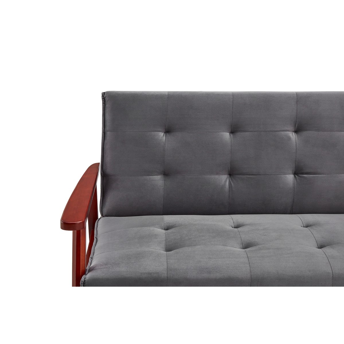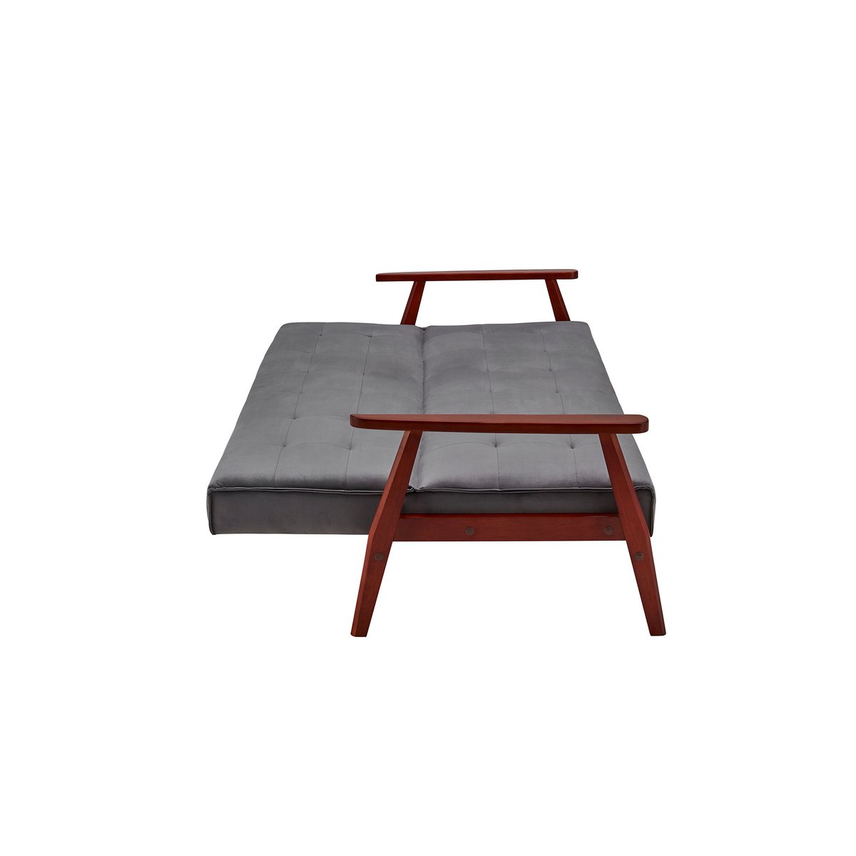 Deze slaapbank met armleuningen in Scandinavische stijl combineert een elegant ontwerp met veelzijdig gebruiksgemak. De stijlvolle bekleding in grijze fluweellook geeft het meubel een luxe uitstraling, terwijl het massief eucalyptushouten frame in kersenkleur zorgt voor een warm en karaktervol contrast. Opvallende stiksels op de zitting en rugleuning versterken het verfijnde design en maken deze slaapbank tot een sfeervolle blikvanger in de woonkamer of logeerkamer.