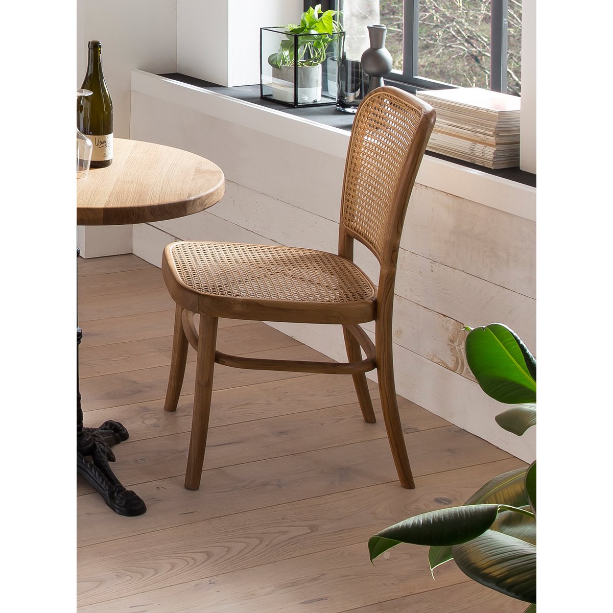 Het inherent elegante teakhout, ontworpen met een Weens vlechtwerk van riet in de zitting en rugleuning, zorgt voor een prachtige stoel in de kleur van de natuur. De stoel, die lijkt op een koffiehuisstoel, is handgemaakt en past zich dankzij zijn warme en exotische charme aan elke woonruimte aan. Gecombineerd met fabrieksdesign of vintage, antiek en rustiek past deze zitmeubel altijd. Versierd met een mooi kussen als losse stoel in de logeer- of slaapkamer. In de eetkamer en het woongedeelte biedt hij een comfortabele zitplaats voor uw gasten. In grote hallen of gangen, op het terras of in de wintertuin biedt deze stoel met zijn prachtige, natuurlijke uitstraling een plek om te ontspannen. Zithoogte 46 cm, zitdiepte 42 cm, zitbreedte 44 cm