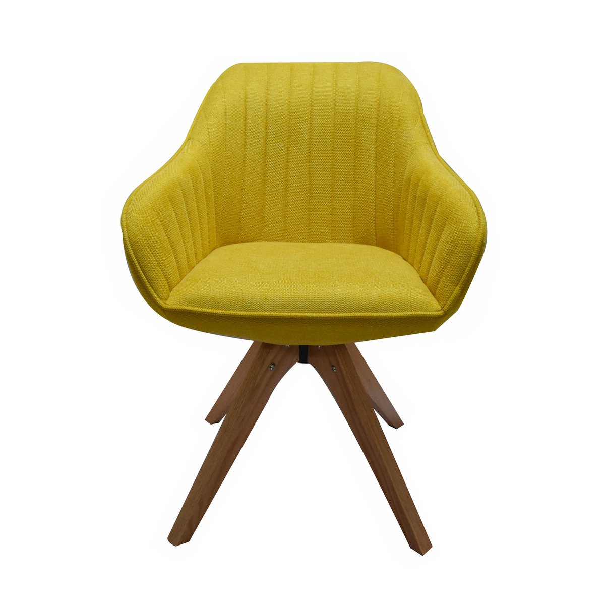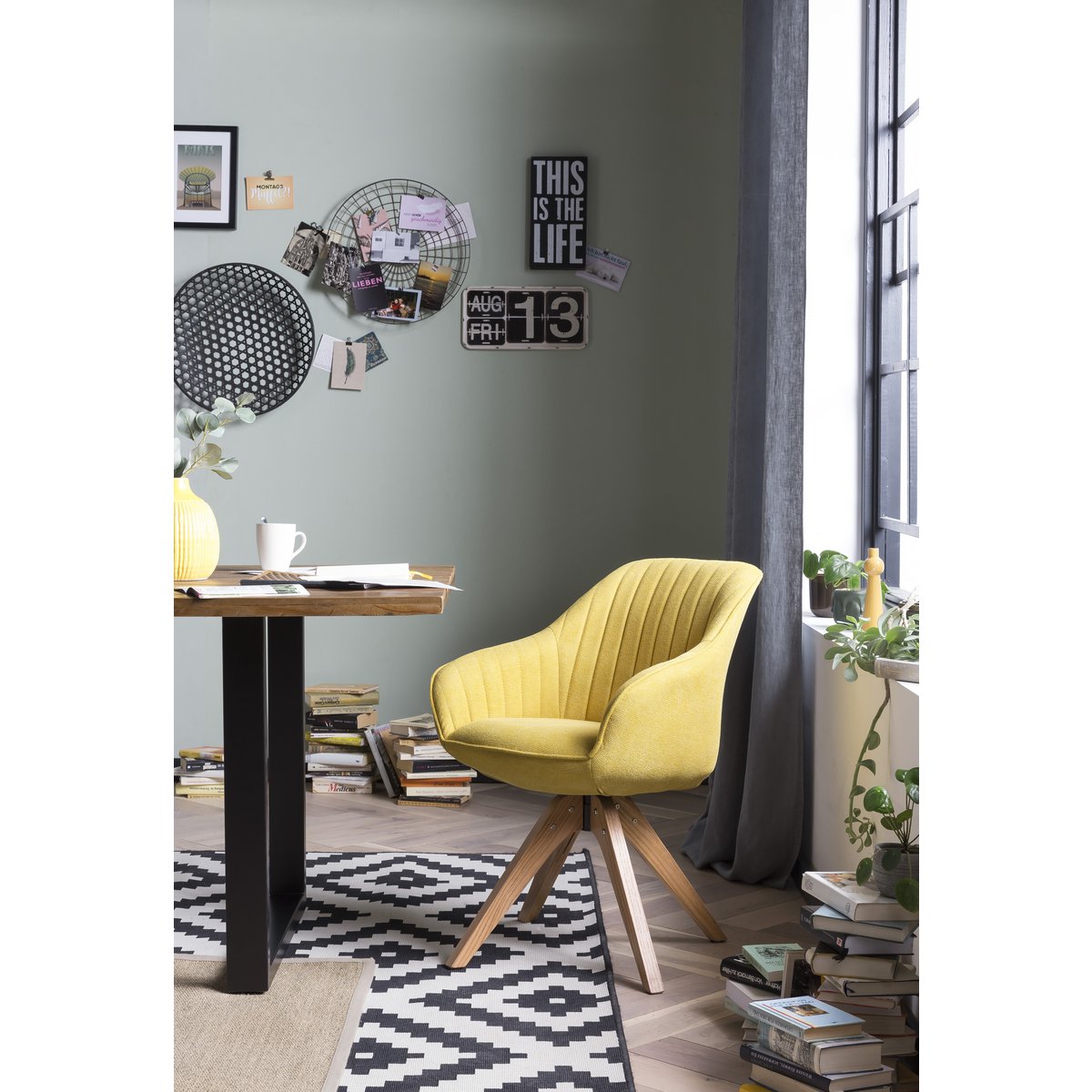 De chique draaistoel maakt elke eethoek nog uitnodigender. Voor de hoes is gebruik gemaakt van hoogwaardige stof in vrolijk mosterdgeel. De armleuningen en de zachte vulling met mooie stiksels aan de binnenkant maken het zitten bijzonder comfortabel. Het frame is gemaakt van naturel gelakt eikenhout en heeft een trendy stervorm, wat de stoel stabiliteit en stabiliteit geeft. Of het nu gaat om een diner met het gezin, een kopje koffie met een vriendin of om te werken in het thuiskantoor, u zult genieten van uw nieuwe zitmeubels. Je kunt de stoel natuurlijk ook een andere bestemming geven en hem in een andere kamer plaatsen; hij staat overal goed. 100% PES, zithoogte 47,5 cm, zitbreedte 57 cm, zitdiepte 44 cm, hoogte armleuning 61-66 cm.