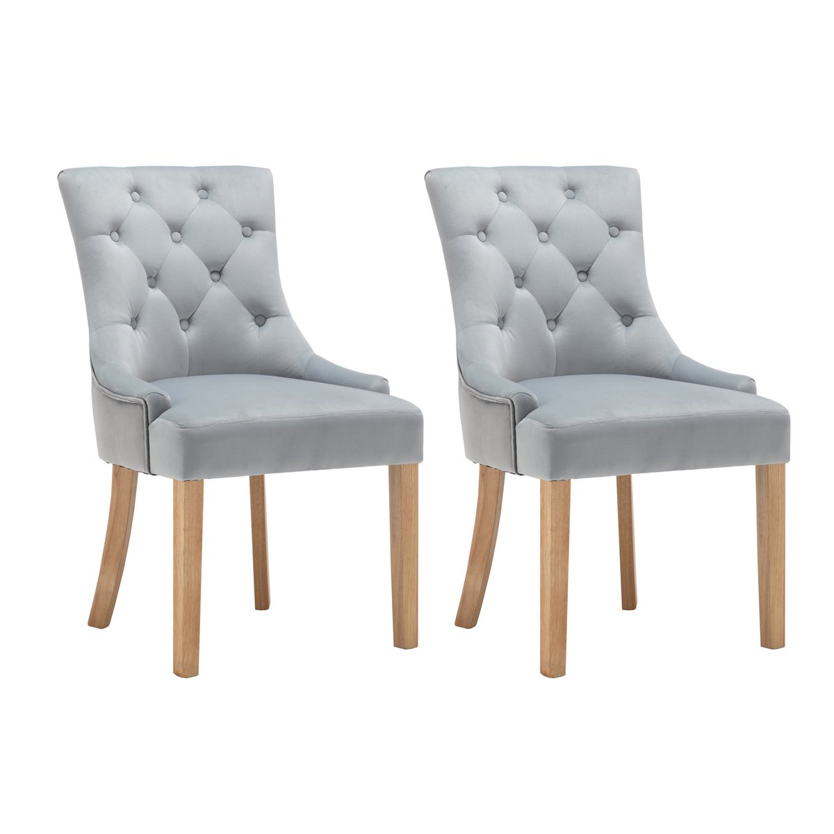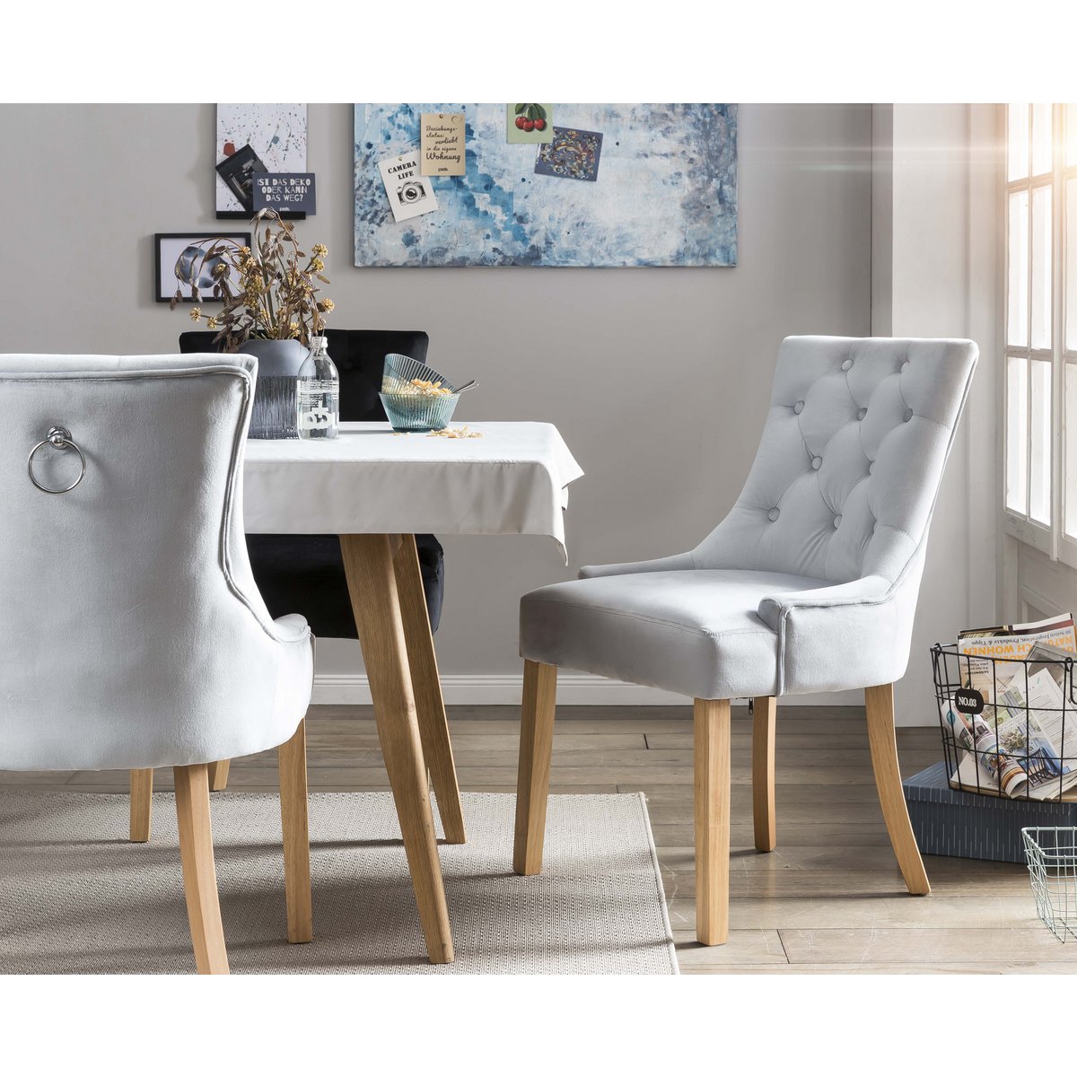 Deze moderne en tegelijkertijd unieke stoel biedt een comfortabele zit en daarnaast valt de stoel op door de prachtige knoopstiksels op de rug. Het materiaal van de poten is Hevea, een houtsoort met een zeer lichte marmering. Deze naturelkleurige stoelpoten passen perfect bij de lichtgrijze fluwelen bekleding. De stoel is geschikt voor de eetkamer, de keuken en de studeerkamer, maar ook als vergaderstoel in een praktijk of kantoor. Een ander hoogtepunt is de chroomkleurige handgreepring aan de buitenste achterkant. 100% polyester, met chroomkleurige greepring aan de achterkant, max. draagvermogen: ca. 150 KG, zithoogte: ca. 52 cm, zitdiepte: ca. 44 cm weerstand, gemiddelde slijtvastheid.