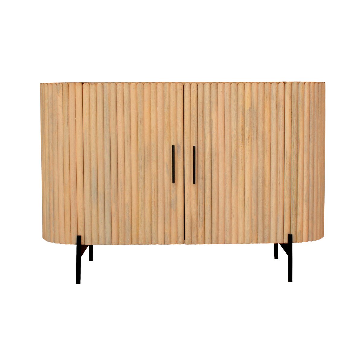 Achter de twee deuren bevindt zich praktische opbergruimte voor allerlei spullen in de woon- of slaapkamer. De verticale houten lamellen geven het meubel extra diepte en maken het ontwerp visueel spannend zonder druk te ogen. De kommode wordt vrijwel voorgemonteerd geleverd, waardoor hij snel klaar is voor gebruik. Daarmee is dit meubel niet alleen een stijlvolle blikvanger, maar ook een praktische keuze voor dagelijks gebruik.