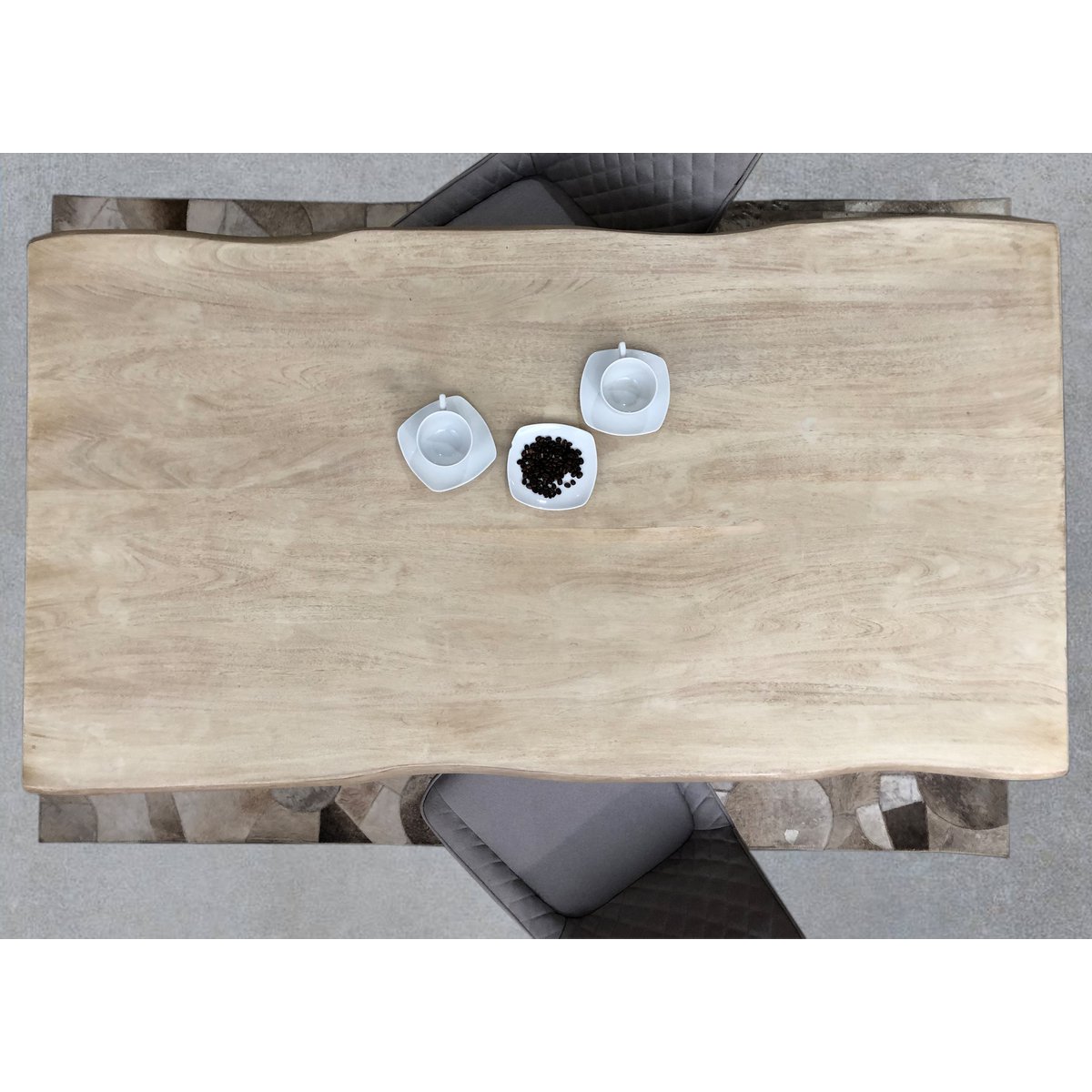 Eettafels met echte boomranden zijn de juiste keuze voor een eetkamer met karakter. Natuurlijke vormen, kleuren en nerven maken elke tafel uniek. Het expressieve tafelblad van acaciahout is net zo individueel als uw woonstijl. Een bijzonder hoogtepunt van deze boomrandtafel zijn de duidelijk zichtbare houtnerf en de dynamische vormen van de tafelranden. Natuurlijke materialen zoals hout maken een ruimte niet alleen comfortabeler, ze hebben ook een positief effect op het binnenklimaat. Het moderne design wordt afgerond door een sledeonderstel van antiek zwart staal. De combinatie van warm hout en koel staal is een echte klassieker in de trendy industriële stijl en creëert vakkundig contrasten. Boomrandtafels passen goed in elke woonstijl en harmoniëren perfect met Scandinavische meubels, moderne leren stoelen of meubels in fabrieksdesign. Let op: Het tafelblad is een natuurproduct. Er kunnen knoestgaatjes, groeischeurtjes en afwijkende kleurversieringen aanwezig zijn, die geen reden tot klagen zijn maar juist de authenticiteit van het hout onderstrepen. Plaatdikte 26 mm, bestaande uit ca. 5-8 planken (meestal 7 stuks), framebreedte 74 cm, afmeting van de 4kt buis 8×4 cm, met 2 stelschroeven voor hoogteverstelling, onder de plaat zitten 3 noklijsten , afstand tussen de poten 83 cm, houten oppervlak 2 x geverfd en in de was gezet.