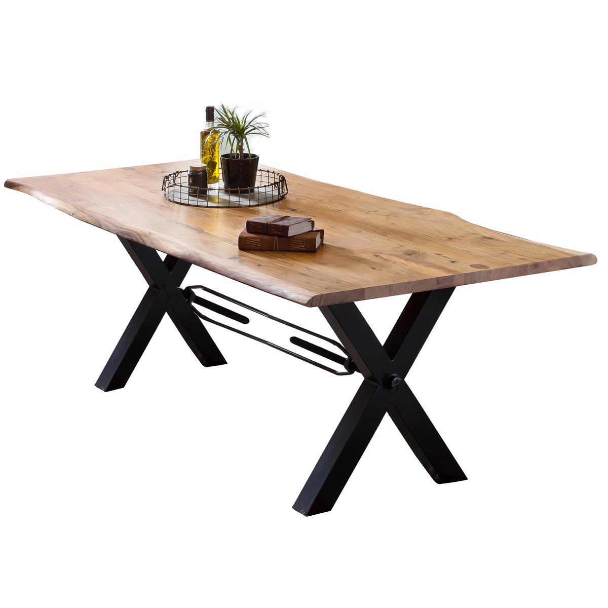 Als u een tafel met karakter en uniekheid wilt, bent u hier aan het juiste adres. Deze eettafel zal niet gemakkelijk terug te vinden zijn. Het massief houten tafelblad is gemaakt van acaciahout met een natuurlijke boomrand en is zo uniek als de natuur. De natuurplaat maakt bovendien indruk met zijn dikte van 36 mm. Het moderne X-frame in antiek zwart vormt een mooi contrast met het naturel tafelblad, zorgt voor een aangename industriële stijl en combineert comfort met koelte. Je eethoek wordt een blikvanger en een ontmoetingsplek om heerlijke uurtjes door te brengen met familie en vrienden. Hier gebeurt veel meer dan alleen de dagelijkse maaltijden. Let op: Het tafelblad is een natuurproduct. Er kunnen knoestgaten, groeischeurtjes en afwijkende kleurversieringen aanwezig zijn, die geen reden tot klagen zijn maar juist de authenticiteit van het hout onderstrepen. Plaatdikte 36 mm.