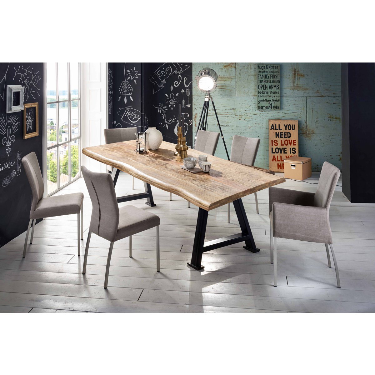 Als u een tafel met karakter en uniekheid wilt, bent u hier aan het juiste adres. Deze eettafel zal niet gemakkelijk terug te vinden zijn. Het tafelblad is gemaakt van mangohout met een natuurlijke boomrand en is zo uniek als de natuur. De plaat maakt bovendien indruk met zijn totale dikte van 56 mm. Het trendy A-frame van metaal in antiek zwart biedt een mooi contrast met het tafelblad, zorgt voor een aangename industriële stijl en combineert comfort met koelte. Je eethoek wordt een eyecatcher en een ontmoetingsplek om heerlijke uurtjes door te brengen met familie en vrienden. Hier gebeurt veel meer dan alleen de dagelijkse maaltijden. Let op: Het tafelblad is een natuurproduct. Er kunnen knoestgaten, groeischeurtjes en afwijkende kleurversieringen aanwezig zijn, die geen reden tot klagen zijn maar juist de authenticiteit van het hout onderstrepen. Plaatdikte verdubbeld naar 56 mm, breedte van de vierkante buizen 5 cm, oversteek 19 cm.
