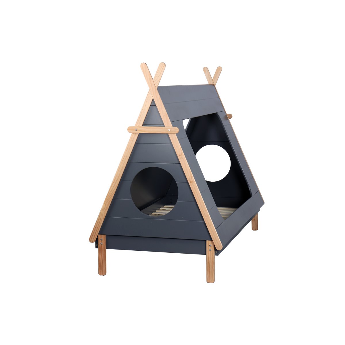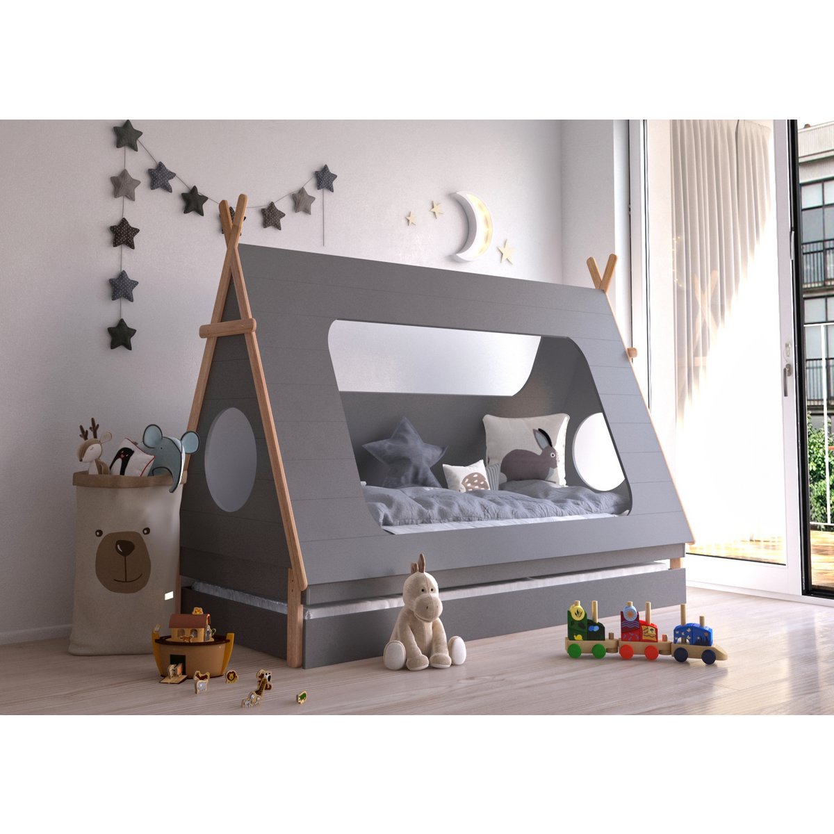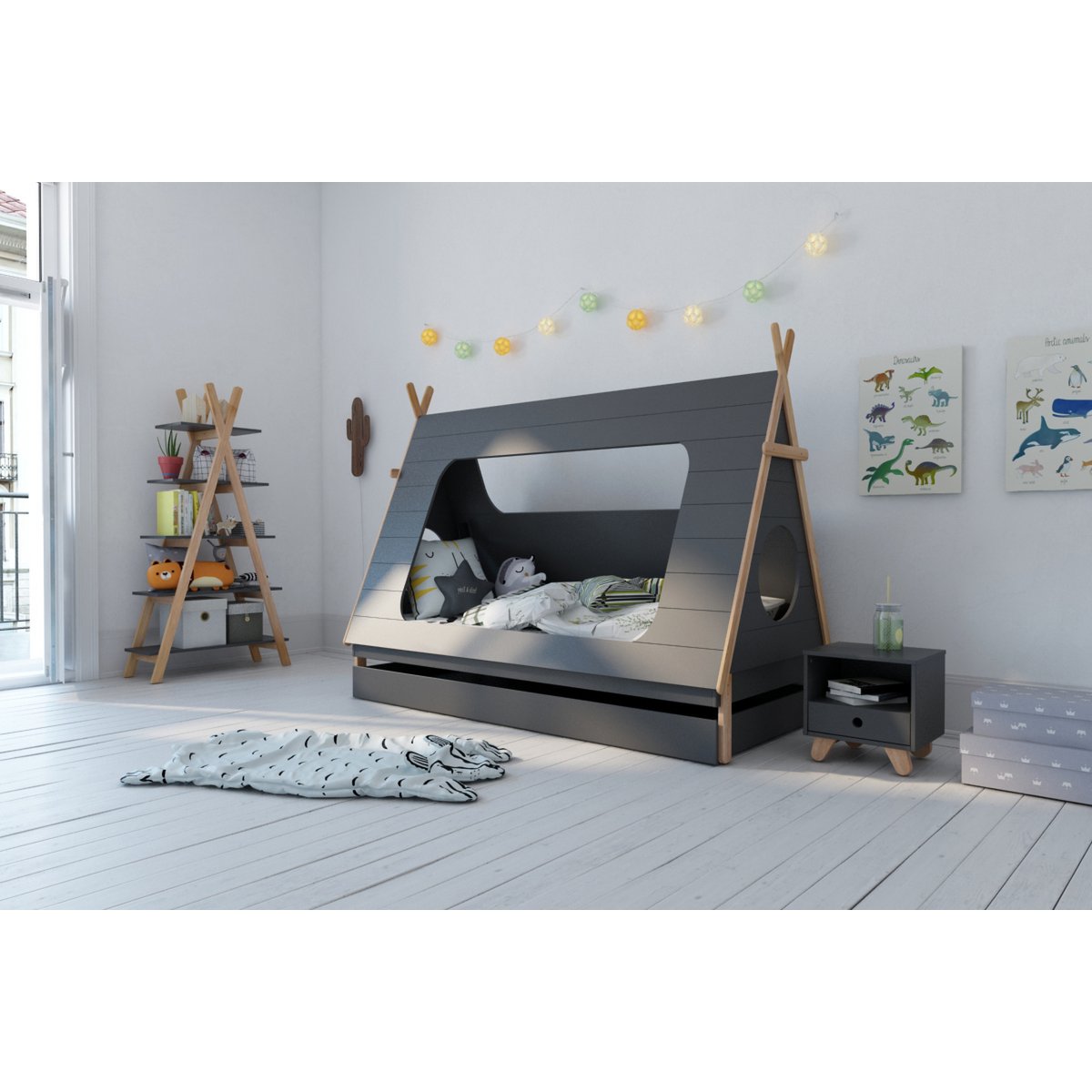 Dit tentbed voor de kinderkamer combineert speels design met praktische opbergruimte en comfortabel slaapgemak. Het moderne contrast tussen donkergrijze MDF panelen en het naturel dennenhouten frame geeft het bed een warme, tijdloze uitstraling die mooi past in verschillende kinderkamers.