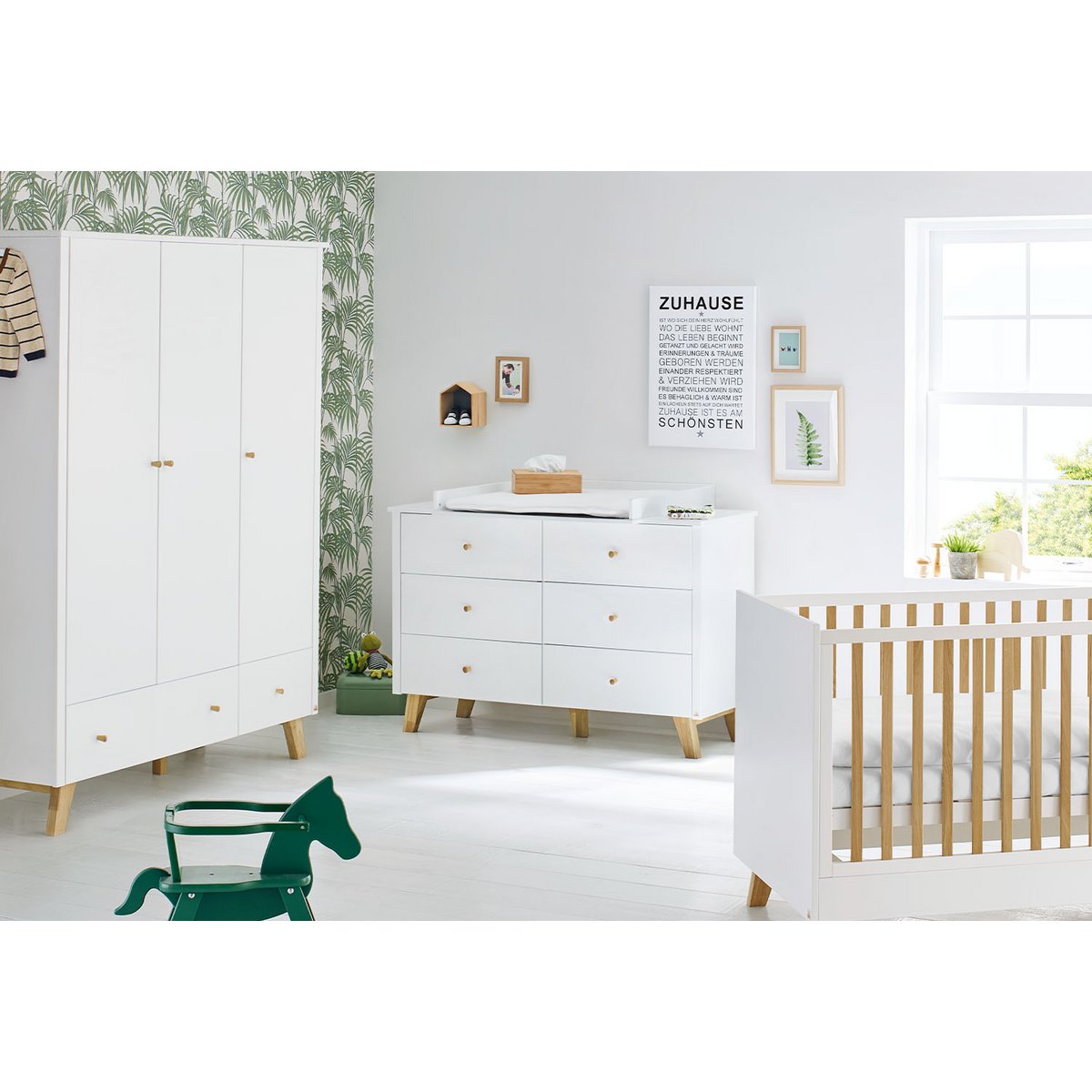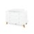 Deze trendy, extra brede commode met afneembare verschoonopzet is de ideale verzorgingsplek voor een moderne babykamer. De commode is gemaakt van wit mat gelakt MDF in combinatie met massief eikenhout, afgewerkt met een blanke lak waardoor het natuurlijke houtpatroon mooi zichtbaar blijft. Dankzij de stijlvolle retro-look brengt deze commode een warme en tijdloze sfeer in de kamer.
