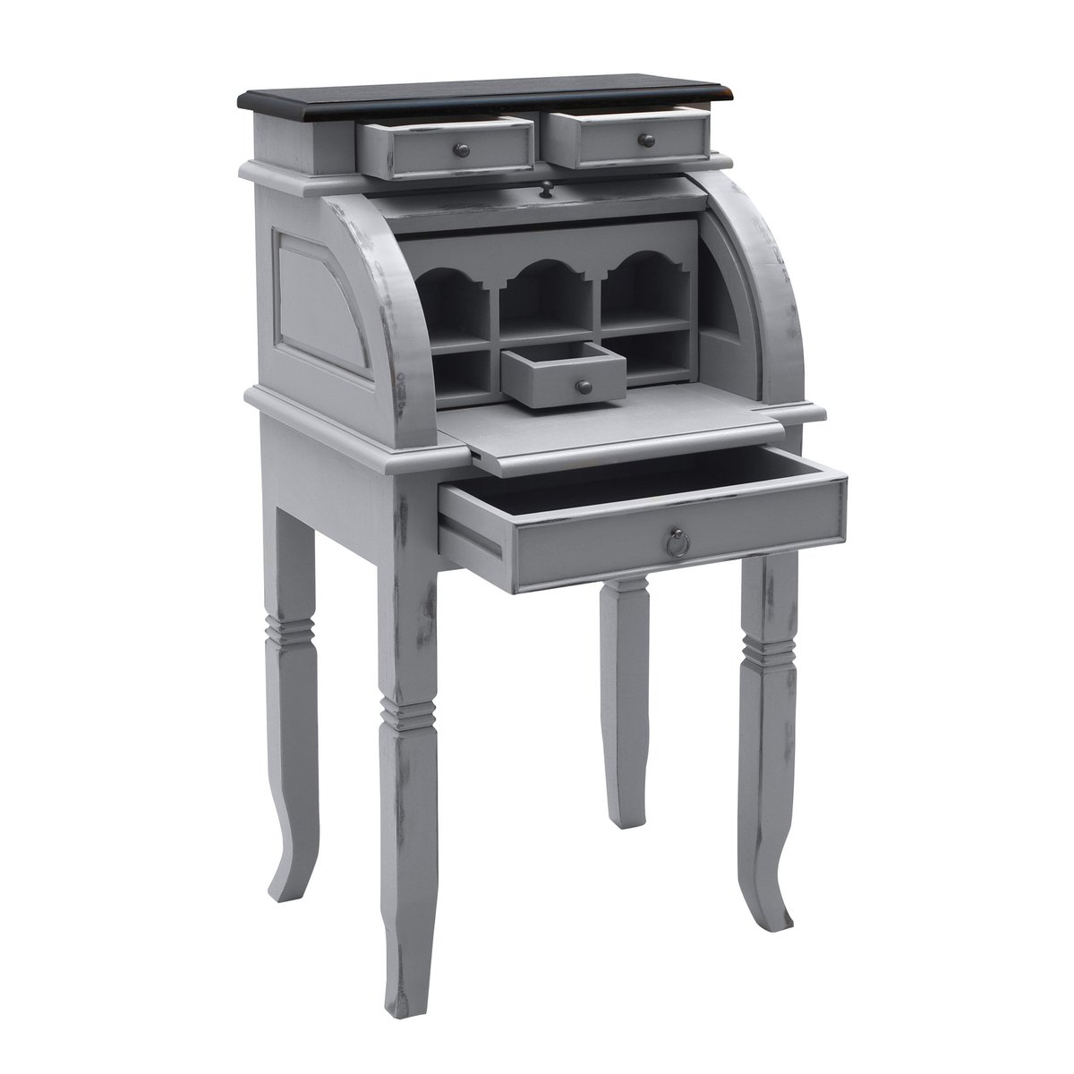 Deze charmante secretaire is een praktische en stijlvolle werkplek in compact formaat. Het meubel heeft een tijdloos vintage ontwerp en biedt verrassend veel opbergruimte dankzij meerdere laden, open vakken en een rolluik. Het uittrekbare schrijfblad vergroot het werkoppervlak en maakt deze kast extra functioneel.