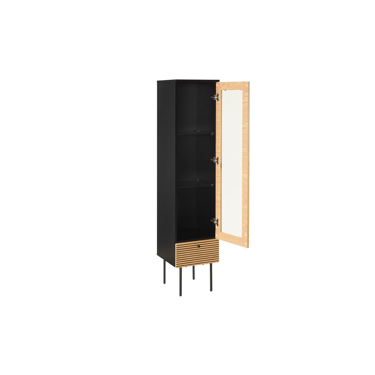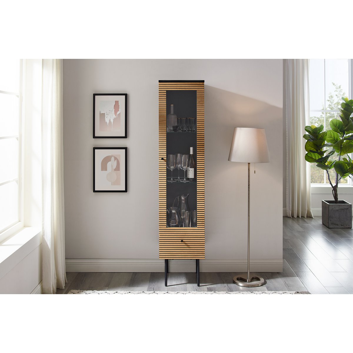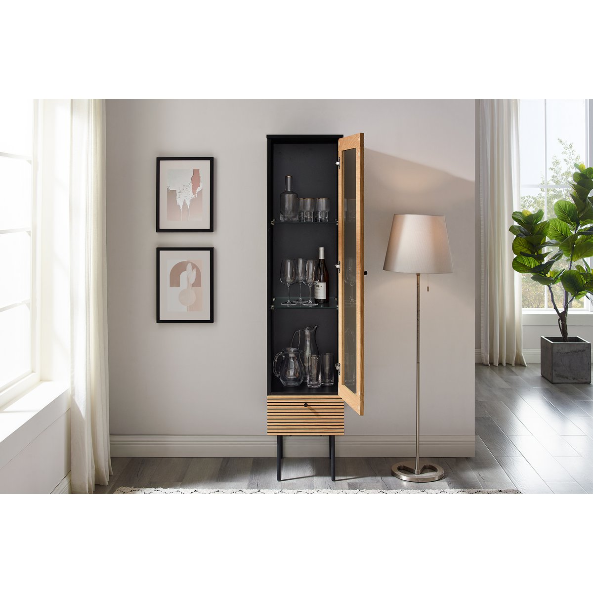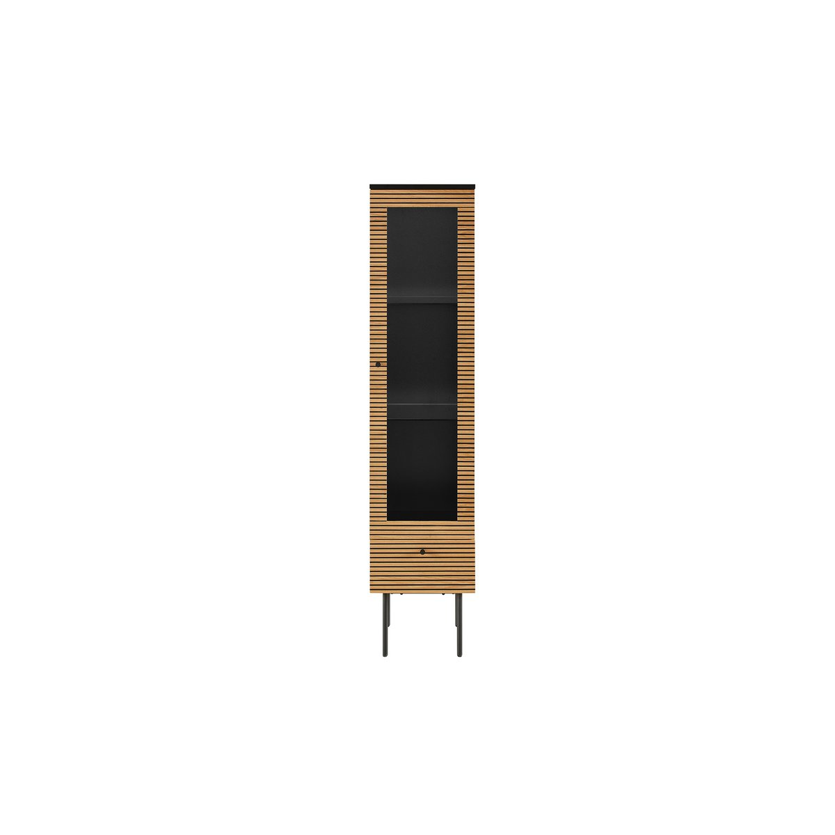 Skandinavischer Stil modern geïnterpreteerd! Die Vitrine bietet Ihnen schlichte nordische Eleganz. De combinatie van de korpus met MDF-holz met echte echte meubelen en de zwarte binnenkant biedt een grote kunstcontrast. Het MDF-Holz-front is met een echt holzmeubel uitgerust en is een van de enige blikken. Het ontwerp met het filigrane ontwerp zorgt voor een luchtige optie en een modern loftkarakter. De paneeloptiek van de eichenmeubels is optisch voor het gewisse etwas. Schubladen und Tür (Links- of Rechtsanschlag montierbar) mit Softclosefunktion (DTC-Scharnier und Gleitschiene), Schubladeninnenmaße: ca. B29,8xD33,5xH9,5 cm. Voorzijde: MDF (Mitteldichte Holzfaserplatte), furniert (Holzart: Eiche), Gestell: Metall pulverbeschichtet Schwarz, Korpus mit kratzfester PU-Lackierung.