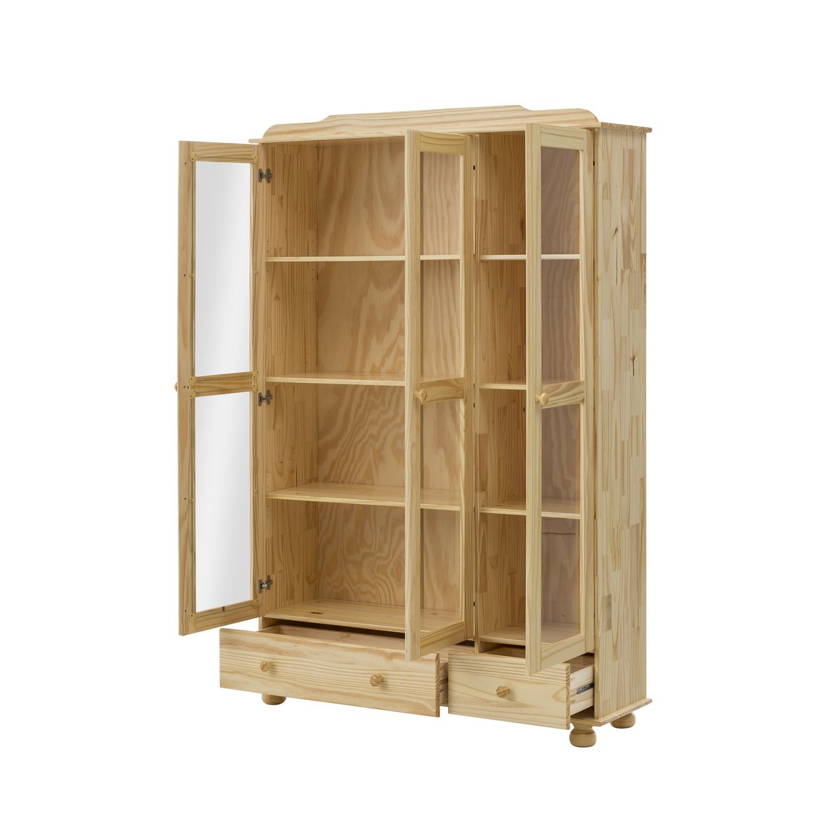 Deze grote vitrinekast in landelijke stijl houdt uw woonruimte stijlvol en overzichtelijk. De kast is gemaakt van massief grenenhout en straalt dankzij het warme hout en de klassieke vormgeving een sfeervolle en tijdloze charme uit. Achter de drie glazen deuren kunt u servies, woondecoratie, glazen of andere bijzondere items op een elegante manier presenteren, terwijl de kast tegelijkertijd zorgt voor rust en orde in de ruimte.