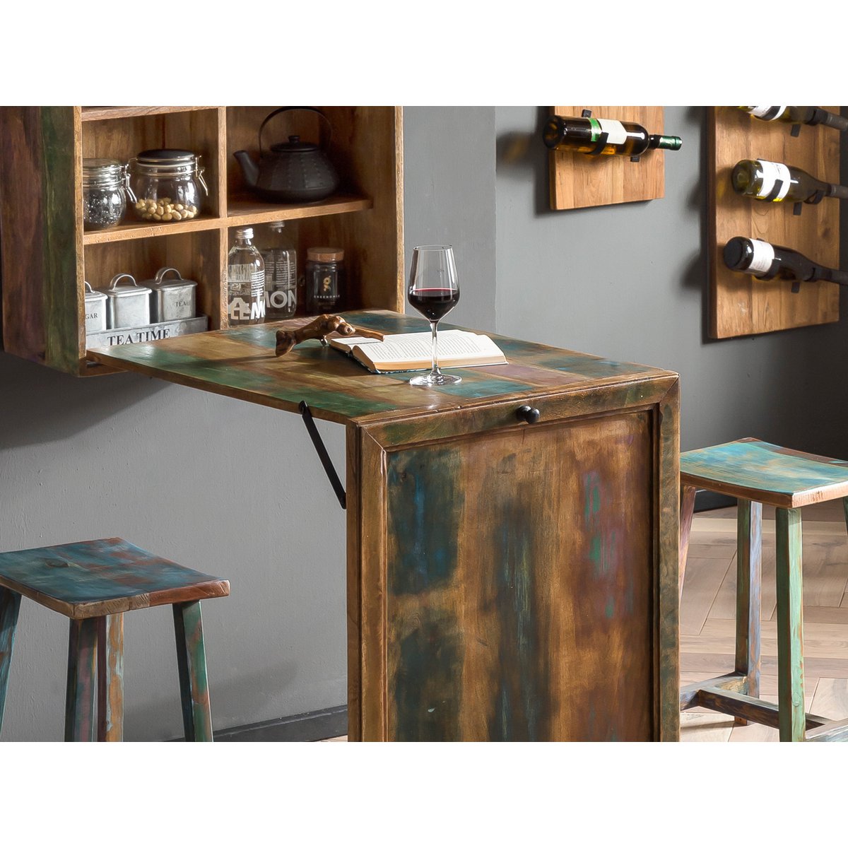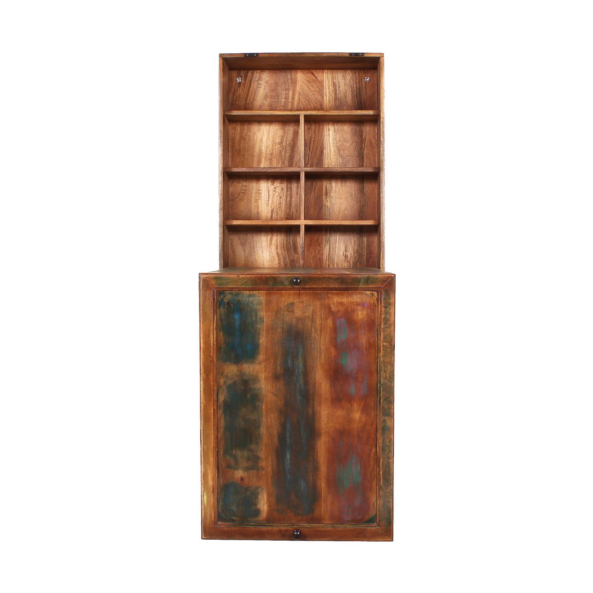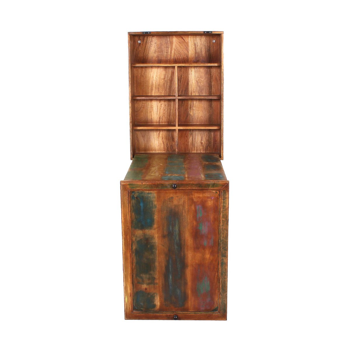 Deze praktische wandkast van kleurrijk beschilderd oud hout in shabby chic stijl is een slimme en sfeervolle oplossing voor kleinere ruimtes. De kast biedt meerdere vakken voor overzichtelijke opbergruimte en heeft bovendien een deur die openklapt tot een tafeltje. Daardoor is dit meubel ideaal voor compacte keukens of andere ruimtes waar flexibiliteit belangrijk is.