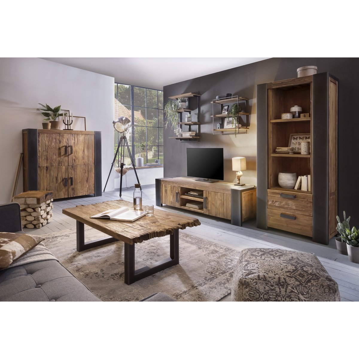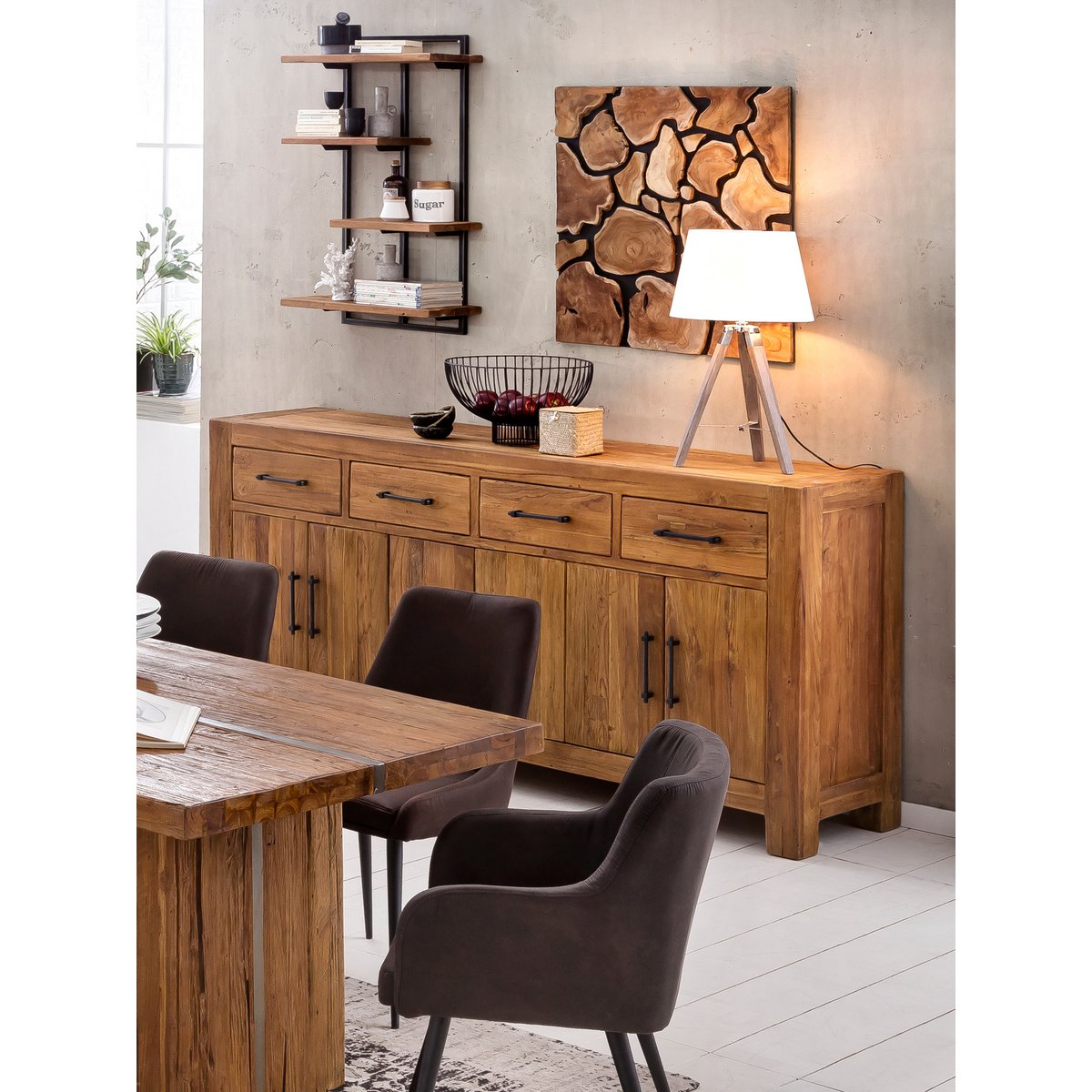 De combinatie van warm teakhout en zwart metalen details zorgt voor een stoere en sfeervolle uitstraling die goed past in industriële, landelijke of natuurlijke interieurs. Met vier ruime planken biedt deze wandplank volop plek voor boeken, decoraties, planten of andere woonaccessoires. Dankzij het tijdloze ontwerp is deze plank een opvallend accent in de woonkamer, keuken, hal of werkkamer.