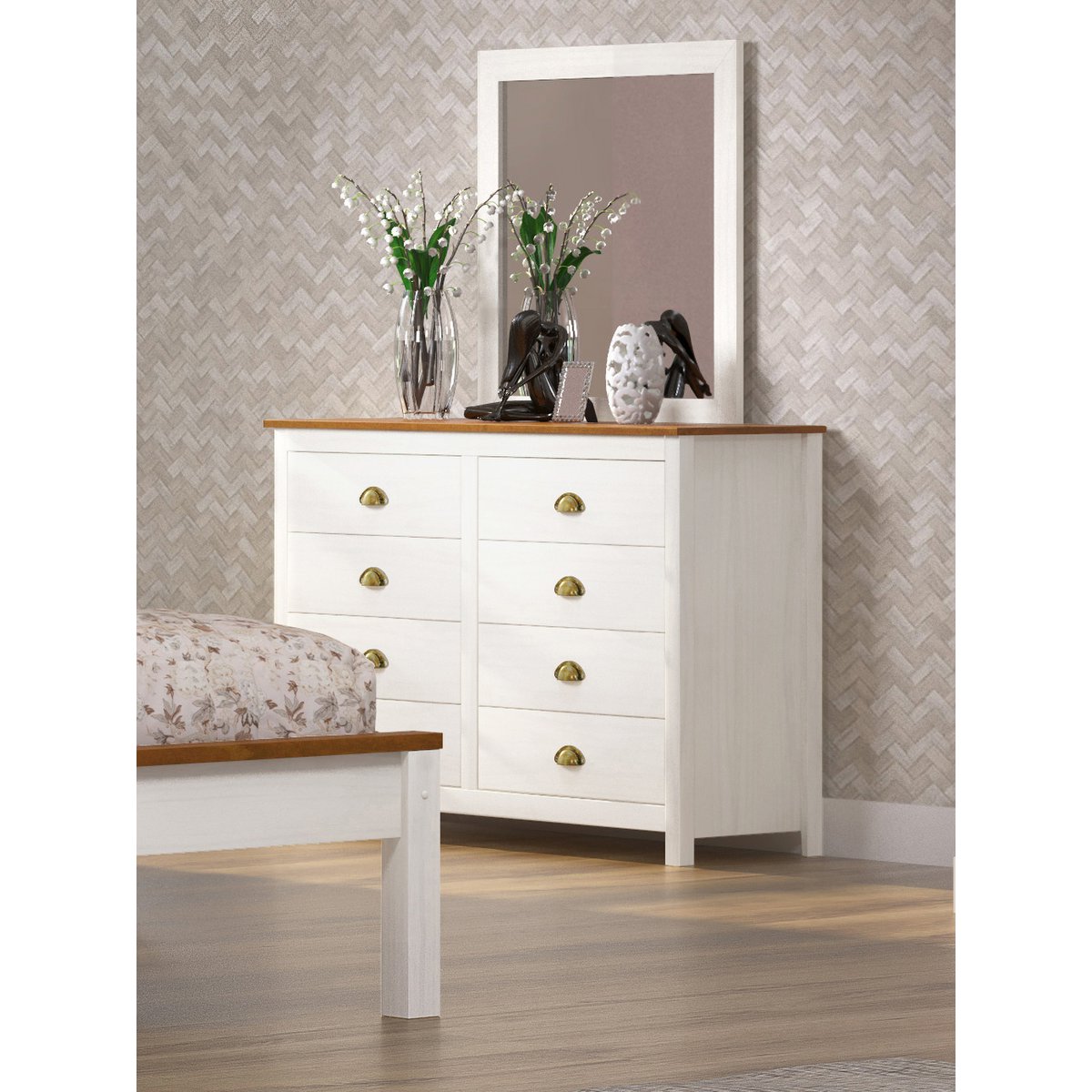Deze stevige ladekast van massief grenen combineert praktische opbergruimte met een tijdloze uitstraling. De witte kast is afgewerkt met een bruine bovenplaat, wat zorgt voor een warm contrast en een landelijke, sfeervolle look. Dankzij de acht ruime laden biedt dit meubel volop plaats voor kleding, accessoires, linnengoed of andere spullen.