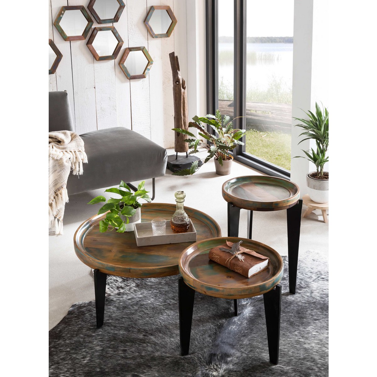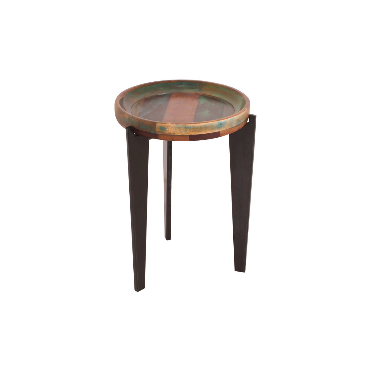 Met deze tafel haal je meteen een vleugje vakantie in huis. De bijzettafel maakt indruk met zijn karakter en uniciteit. Gemaakt van kleurrijk oud hout, nodigt de stijl van het tafeltje uit om te dromen. Het driepotige metalen frame vormt een stijlvol contrast met het ronde tafelblad. Deze staat niet alleen verhoogd, maar kan ook worden verwijderd en als dienblad worden gebruikt. Door zijn traditioneel kleurrijke flair kan deze bijzettafel gemakkelijk in moderne meubels worden geïntegreerd. Plaatdikte 20 mm verdubbeld naar 50 mm, poten bovenaan 7,5 cm breed, onderaan 3 cm breed.