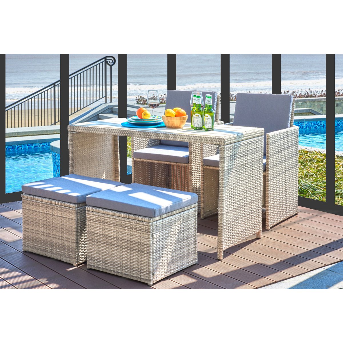 Deze exclusieve 9-delige. Tuinmeubelen bieden u veel ruimte en comfort. Bestaande uit twee stoelen, twee krukken en een tafel voldoet hij niet alleen aan de hoogste visuele normen, maar ook de gebruikte materialen voldoen aan de beste kwaliteitsnormen en zorgen voor stabiliteit en een lange levensduur. Ideaal voor koffie in de middagzon of een glas wijn op een gezellige zomeravond. Geniet van de comfortabele zitplaatsen van deze lounge. De set is gemaakt van weerbestendig, UV-bestendig polyrotan – dit ziet eruit als conventioneel rotanvlechtwerk, maar is veel robuuster. Dit maakt de set ideaal voor buitengebruik. Uiteraard kunt u dit meubel ook in een wintertuin plaatsen. Waar ze ook geplaatst worden, ze roepen een aangename vakantiesfeer op en zijn zeer comfortabel.